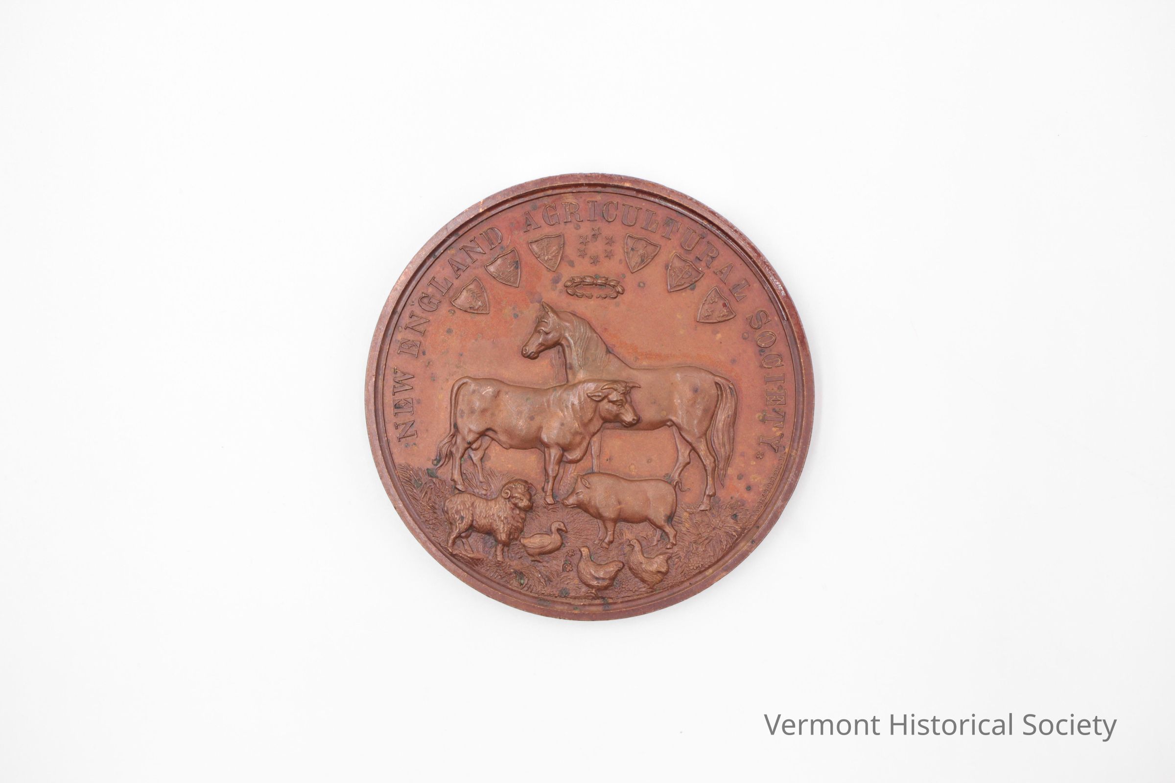 Bronze prize medal molded on the front with images of a horse, cow, pig, sheep, duck, and chickens and the inscription, "NEW ENGLAND AGRICULTURAL SOCIETY", along the top edge. The back is molded with a wreath made from produce with a shield at the center bottom engraved with the year 1881. The top center is molded with an arm holding a hammer and the words, "AWARDED TO". The center is engraved, "A. W. Gray & Sons For best Horse Power Exhibit".Context