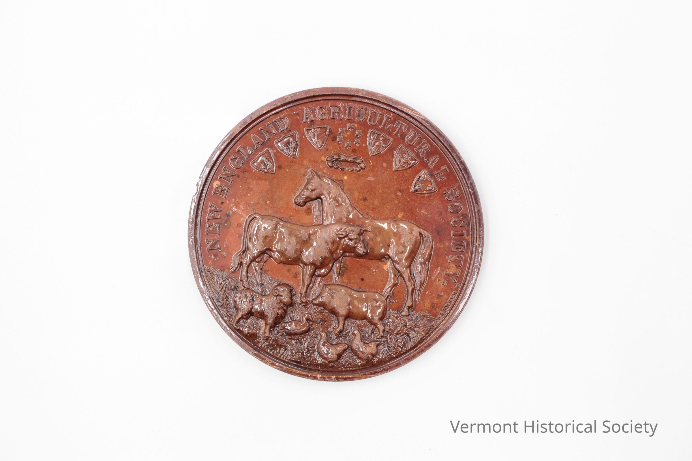 Bronze prize medal molded on the front with images of a horse, cow, pig, sheep, duck, and chickens and the inscription, "NEW ENGLAND AGRICULTURAL SOCIETY", along the top edge. The back is molded with a wreath made from produce with a shield at the center bottom engraved with the year 1881. The top center is molded with an arm holding a hammer and the words, "AWARDED TO". The center is engraved, "A. W. Gray & Sons For best Lifting Jack".Context
