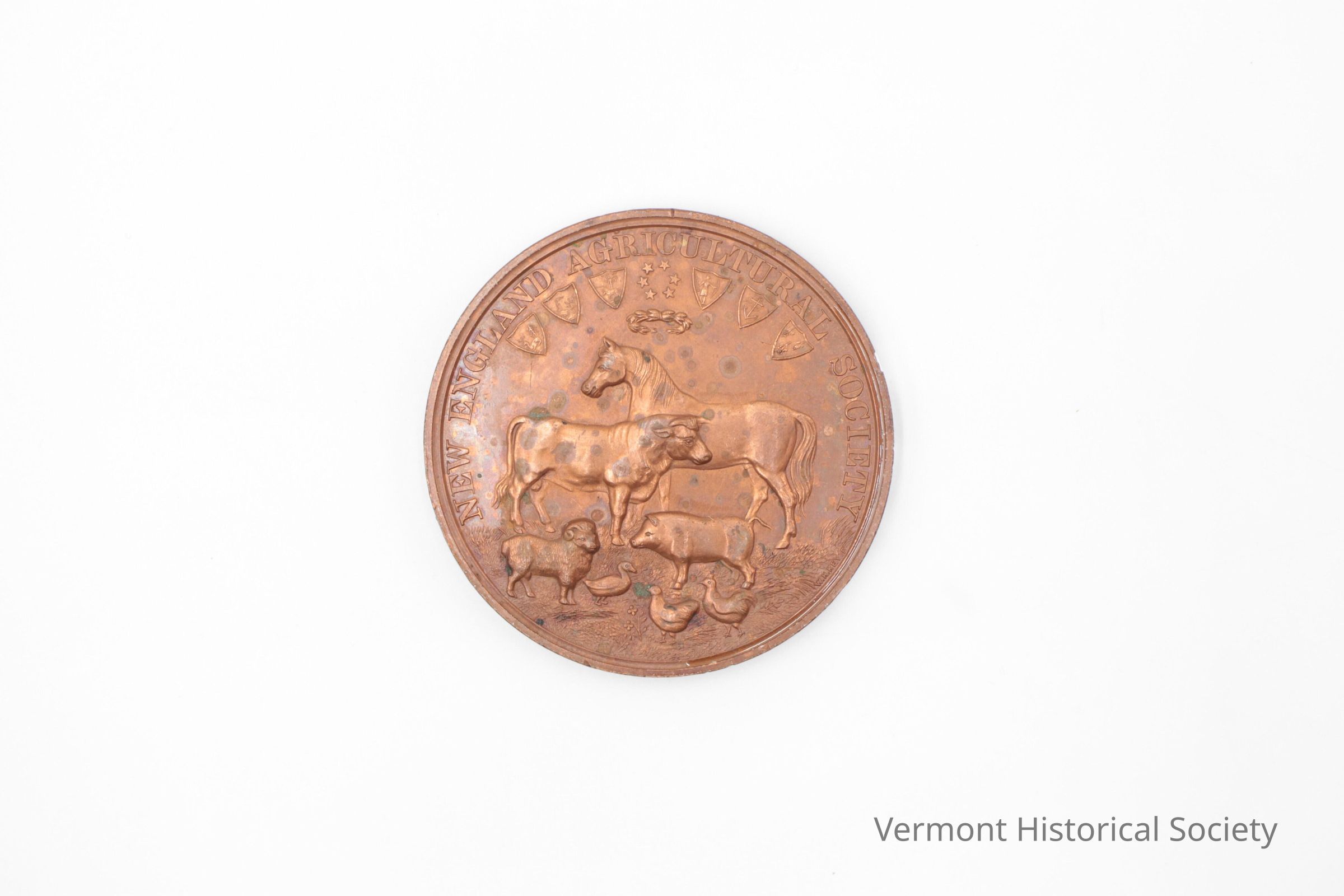 Bronze prize medal molded on the front with images of a horse, cow, pig, sheep, duck, and chickens and the inscription, "NEW ENGLAND AGRICULTURAL SOCIETY", along the top edge. The back is molded with a wreath made from produce with a shield at the center bottom engraved with the year 1880. The top center is molded with an arm holding a hammer and the words, "AWARDED TO". The center is engraved, "A. W. Gray & Sons Best Horse Power Separator & Cleaner".Context