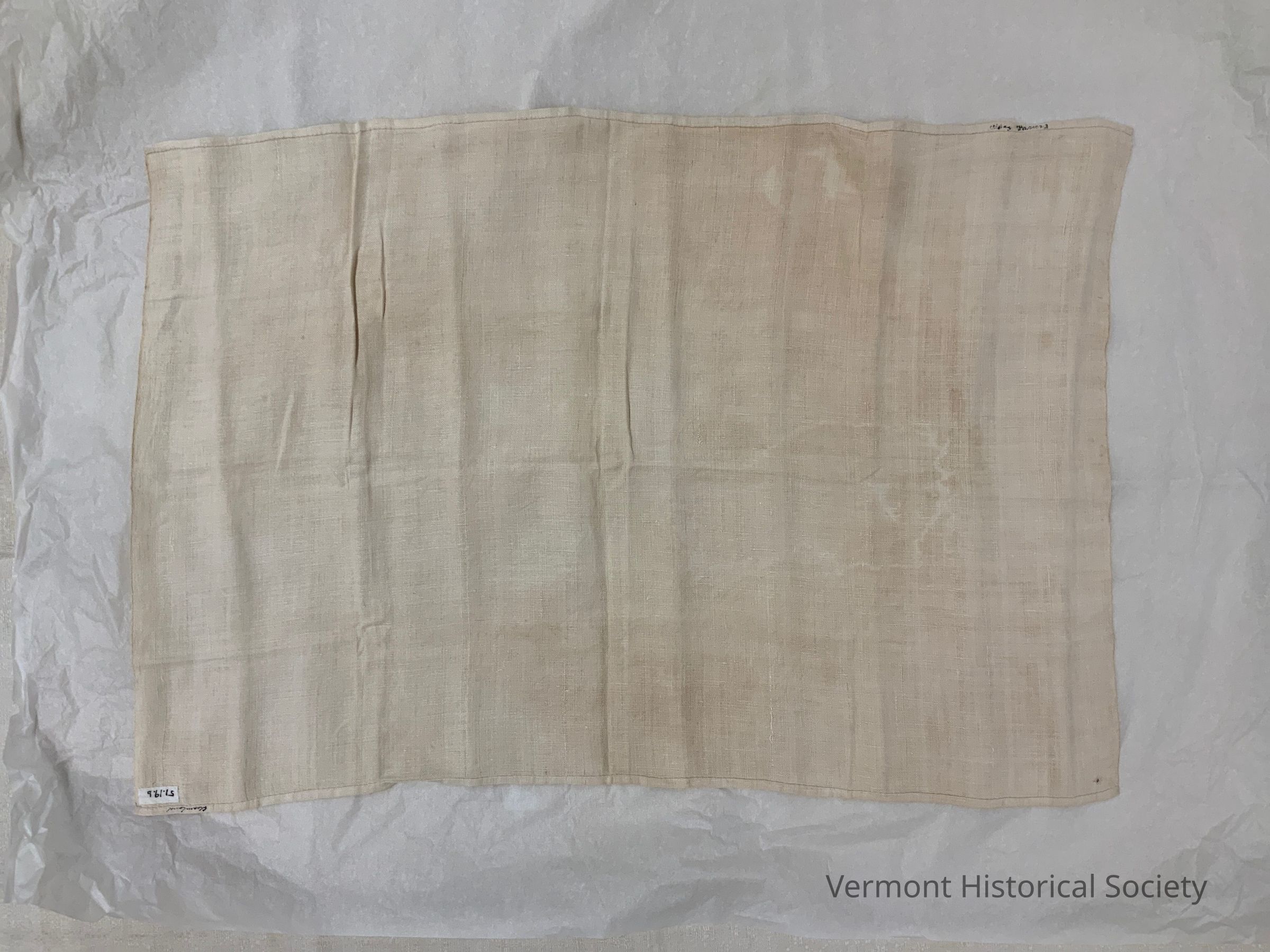 White, plain-woven linen towel. The 2 short ends are selvedges, and the 2 long ends are hemmed. The name, "Mary Powers" is inked along one edge, on the hem. There is another name written on the opposite hem (illegible). There is an eyelet stitched into one corner for hanging.