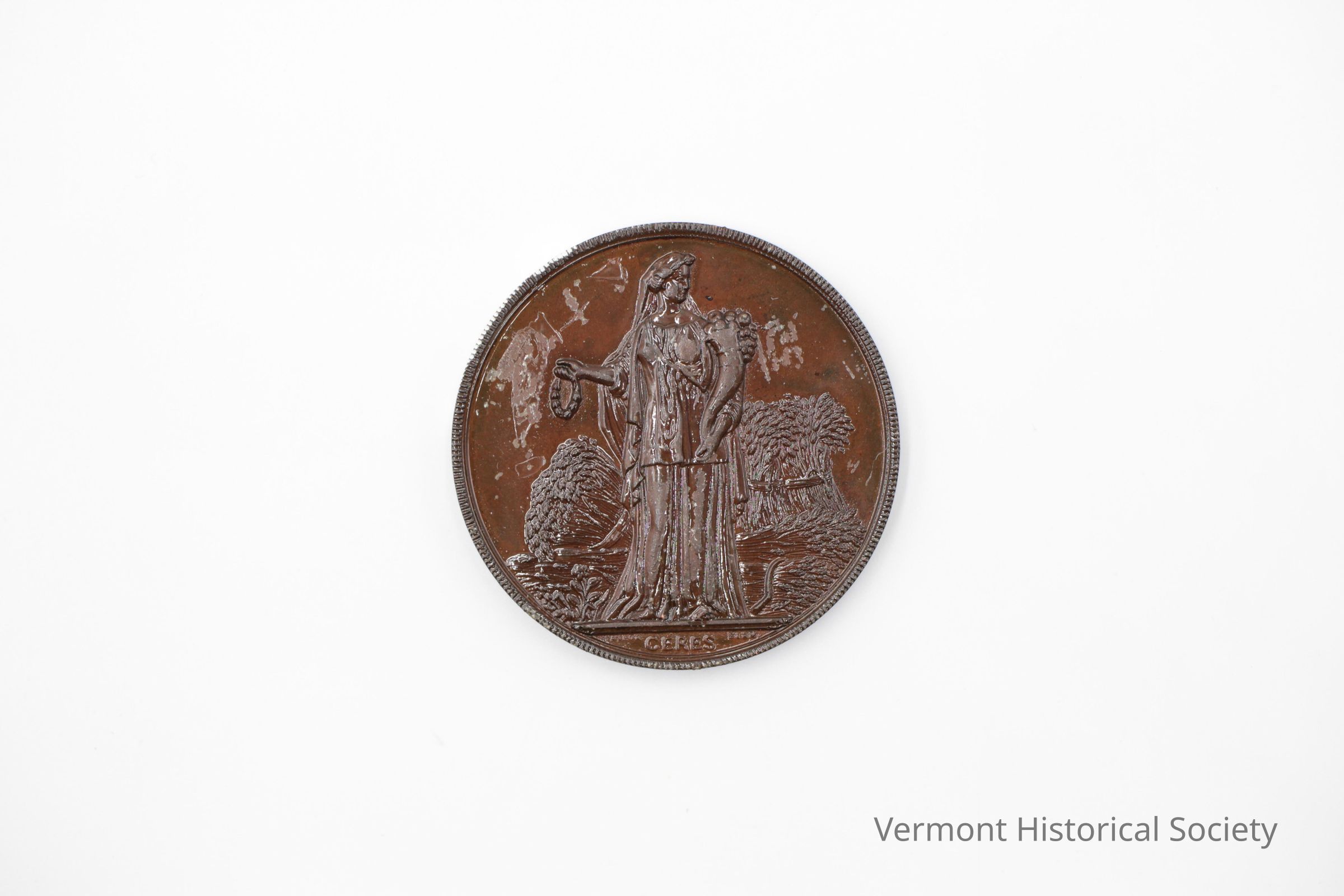 Bronze prize medal molded on the front with an image of a woman wearing a toga and holding a cornucopia. She is surrounded by sheaves of wheat. The image is labeled, "CERES" at the center bottom. The back is molded with a wreath made from produce surrounded by the molded inscription, "NEW YORK STATE AGRICULTURAL SOCIETY". The center is engraved, "To A. W. GRAY & SONS. for Drag Saw Machine. Elmira, 1875."Context