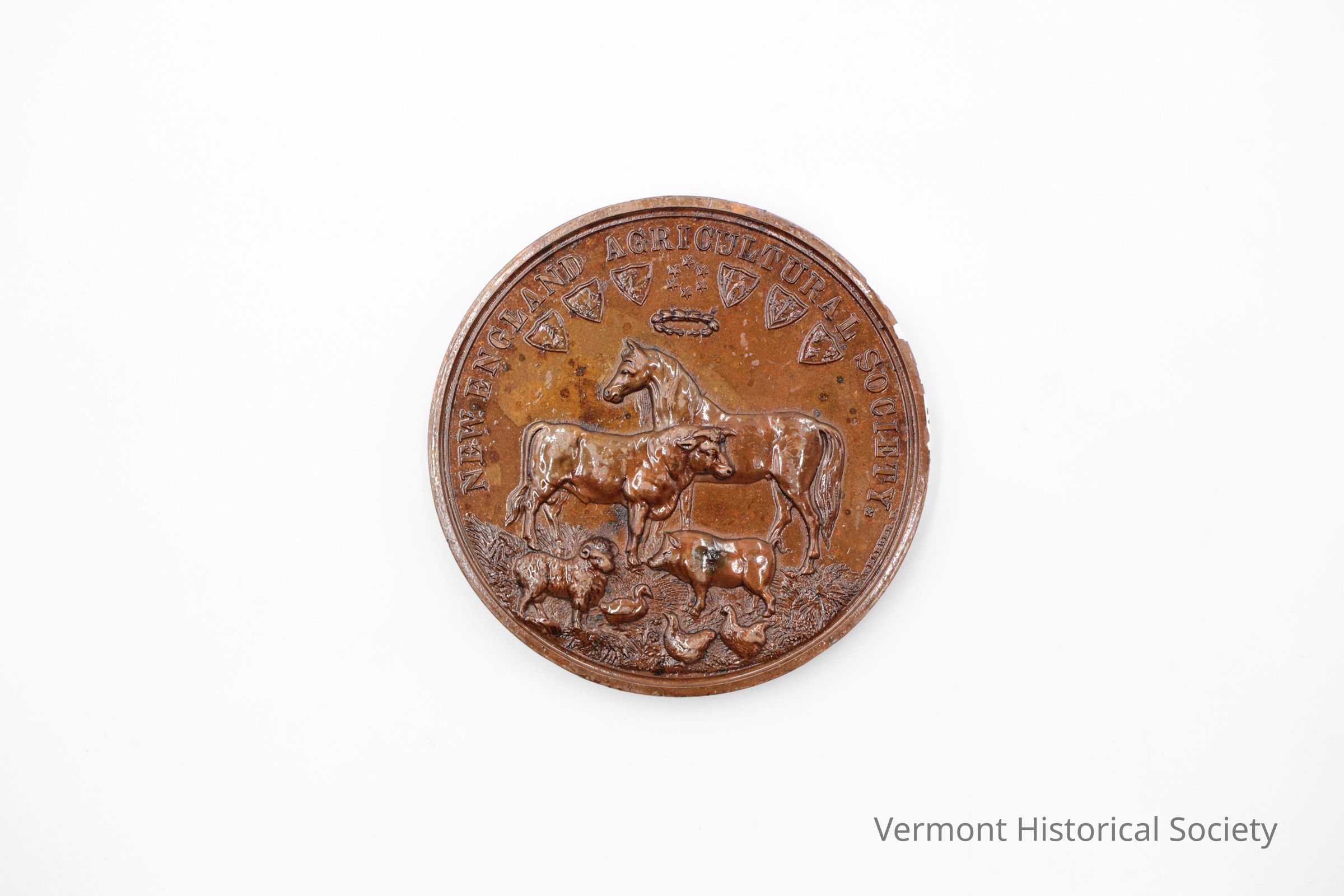 Bronze prize medal molded on the front with images of a horse, cow, pig, sheep, duck, and chickens and the inscription, "NEW ENGLAND AGRICULTURAL SOCIETY", along the top edge. The back is molded with a wreath made from produce with a shield at the center bottom engraved with the year 1874. The top center is molded with an arm holding a hammer and the words, "AWARDED TO". The center is engraved, "A. W. Gray & Son Gray's Separator & Gray's Beater".Context