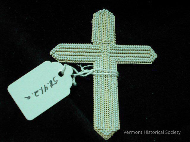 Three beaded bookmarks in the shape of crosses. Each is made of white glass seed beads stitched on perforated paper. The first is a Latin cross. The second is a cross-crosslet. The third is a Greek cross.