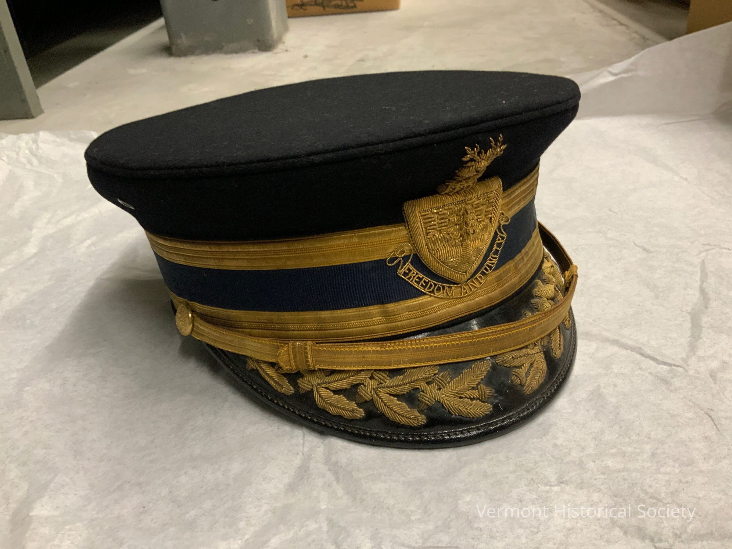 This service cap has a stiff and round crown. The center front of the cap has a gold appliqued patch of the Vermont state seal over a gold and black band that runs around the base of the crown. The short black brim is embroidered with oak branches. On either side of the cap, there are brass buttons, and a gold band runs between them.
