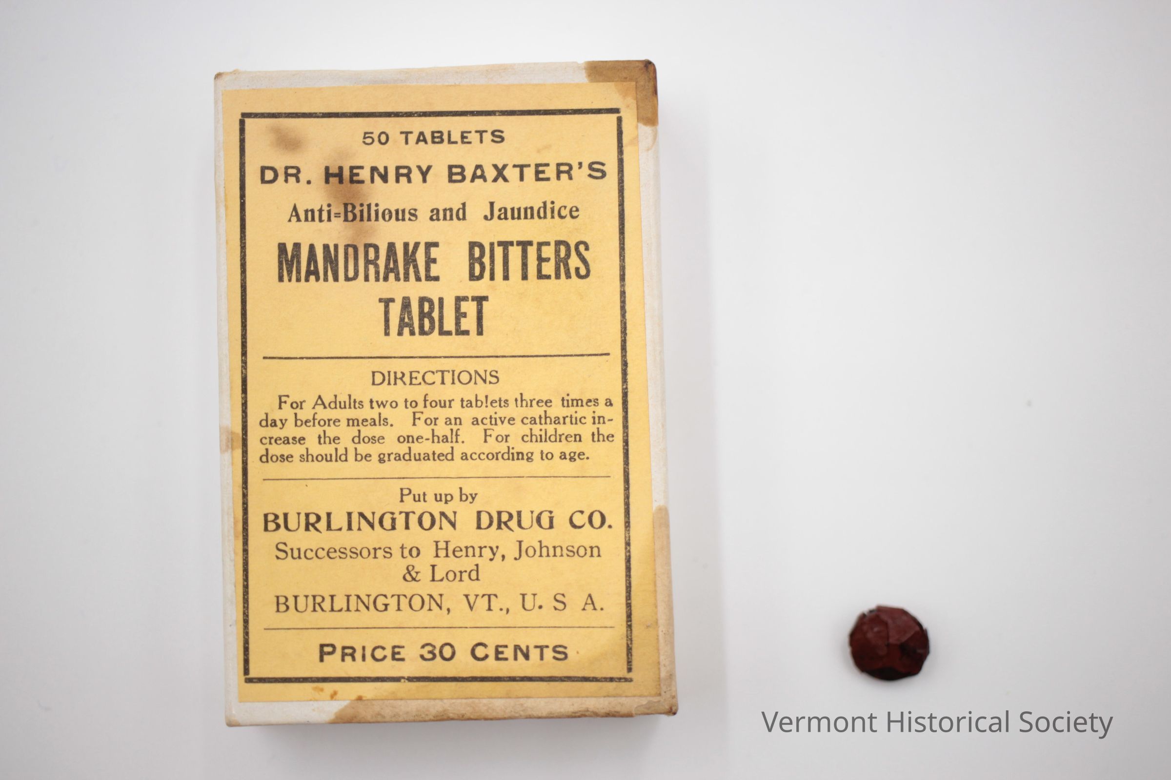 White cardboard box with a yellow paper label that reads, "DR. HENRY BAXTER'S Anti-Bilious and Jaundice MANDRAKE BITTERS TABLET", with directions for use, supplier information, and price. The box is open at both ends with an interior box that slides open. The box originally contained red-coated black tablets, now removed. A paper insert contained with the tablets has an advertisement for the supplies, Burlington Drug Co., as well as instructions for taking three of their products.Use