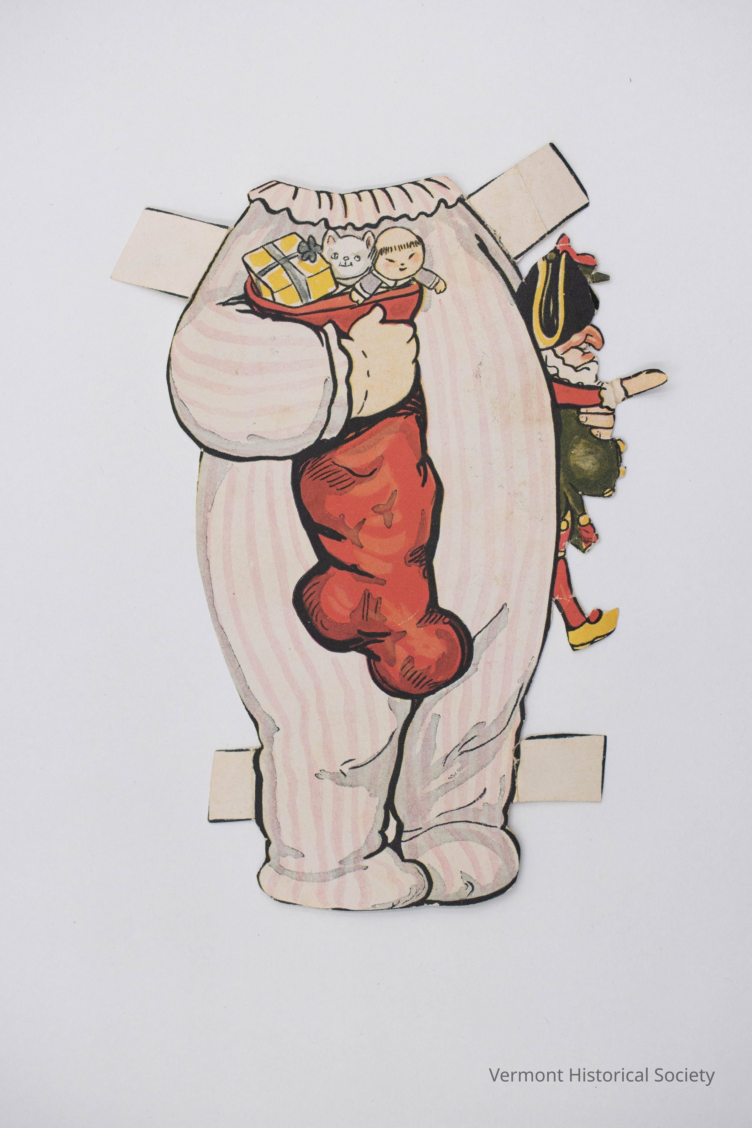 Printed paper pajama suit for a paper doll. The outfit consists of pink-and-white striped full-body pajamas. One arm is holding a doll and the other arm is holding a long red stocking filled with toys. The back shows a portion of a sales catalog page.Context