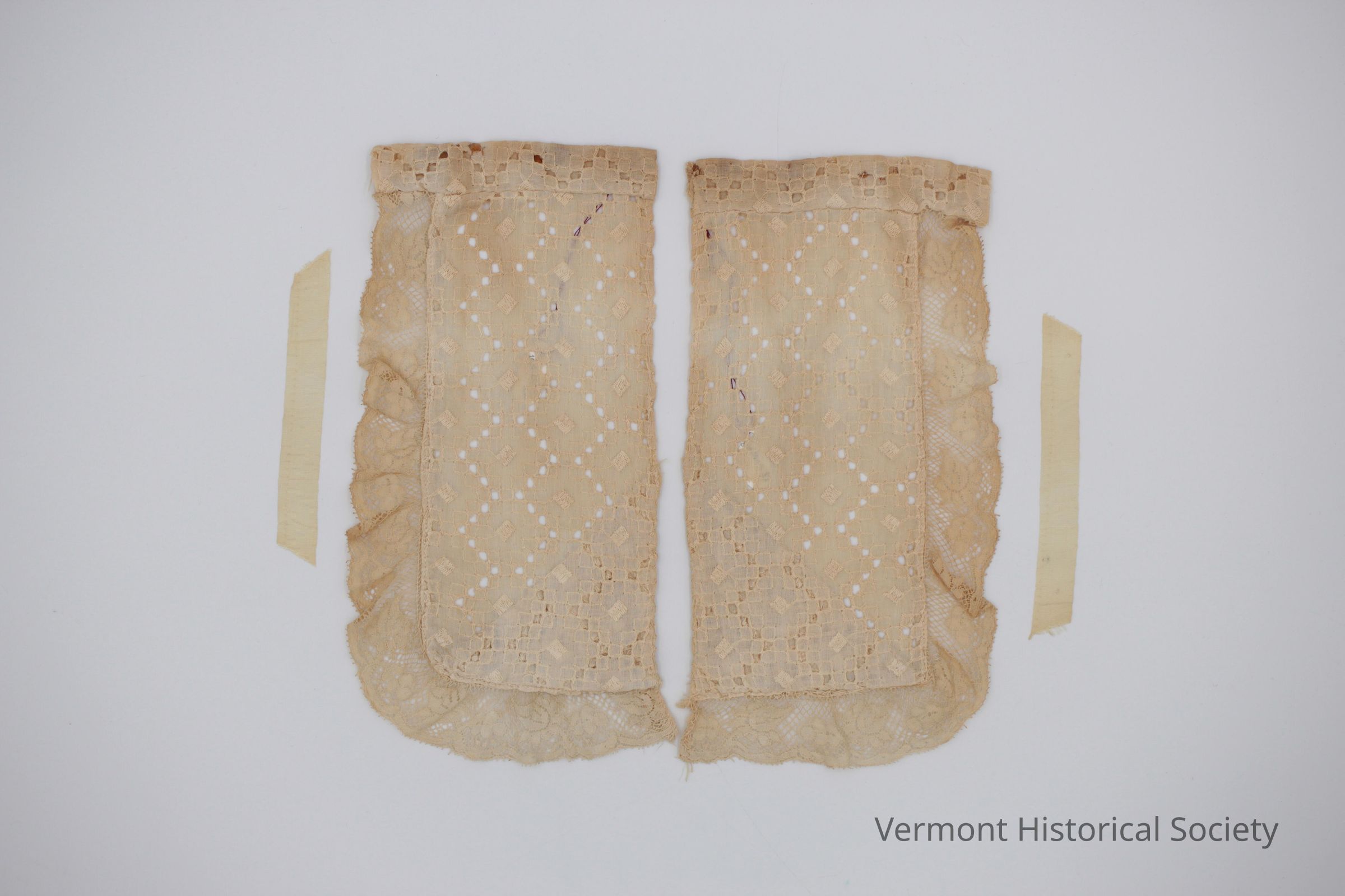 Miniature curtains sized for a dollhouse. The curtains consist of two panels and two tiebacks. The panels are made of white cotton with eyelet embroidery in a zig-zag pattern. They are edged in gathered lace. The tiebacks are made of white ribbon.Context