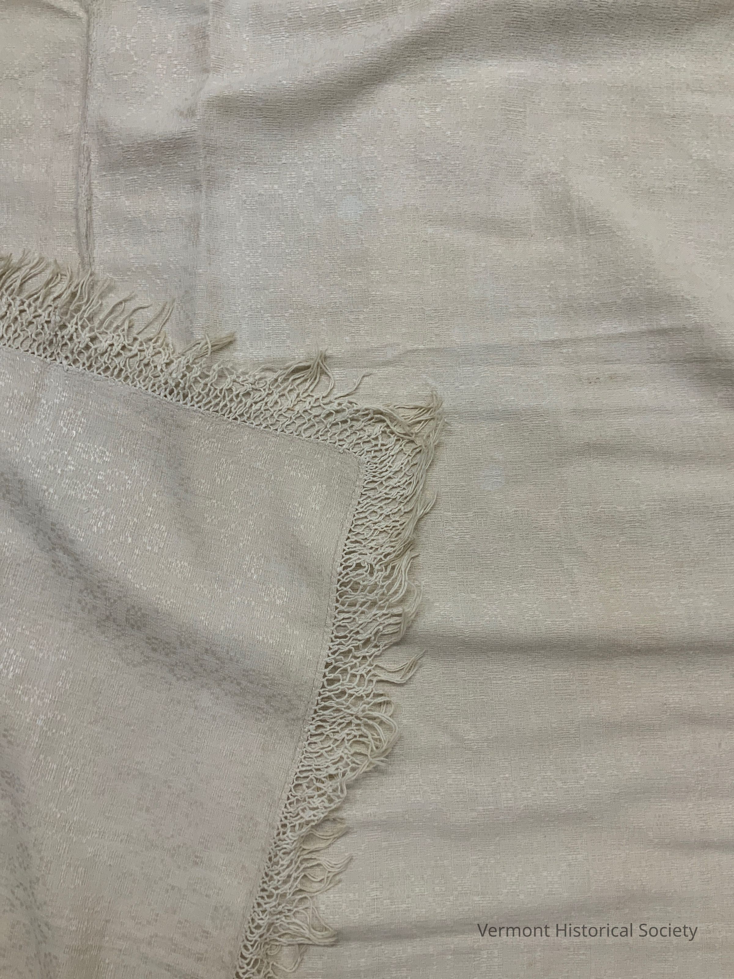 White linen tablecloth with knotted fringe on all 4 sides. The fabric is woven in a Whigh rose pattern. The tablecloth is made from 2 widths of fabric, seamed along the center.Context