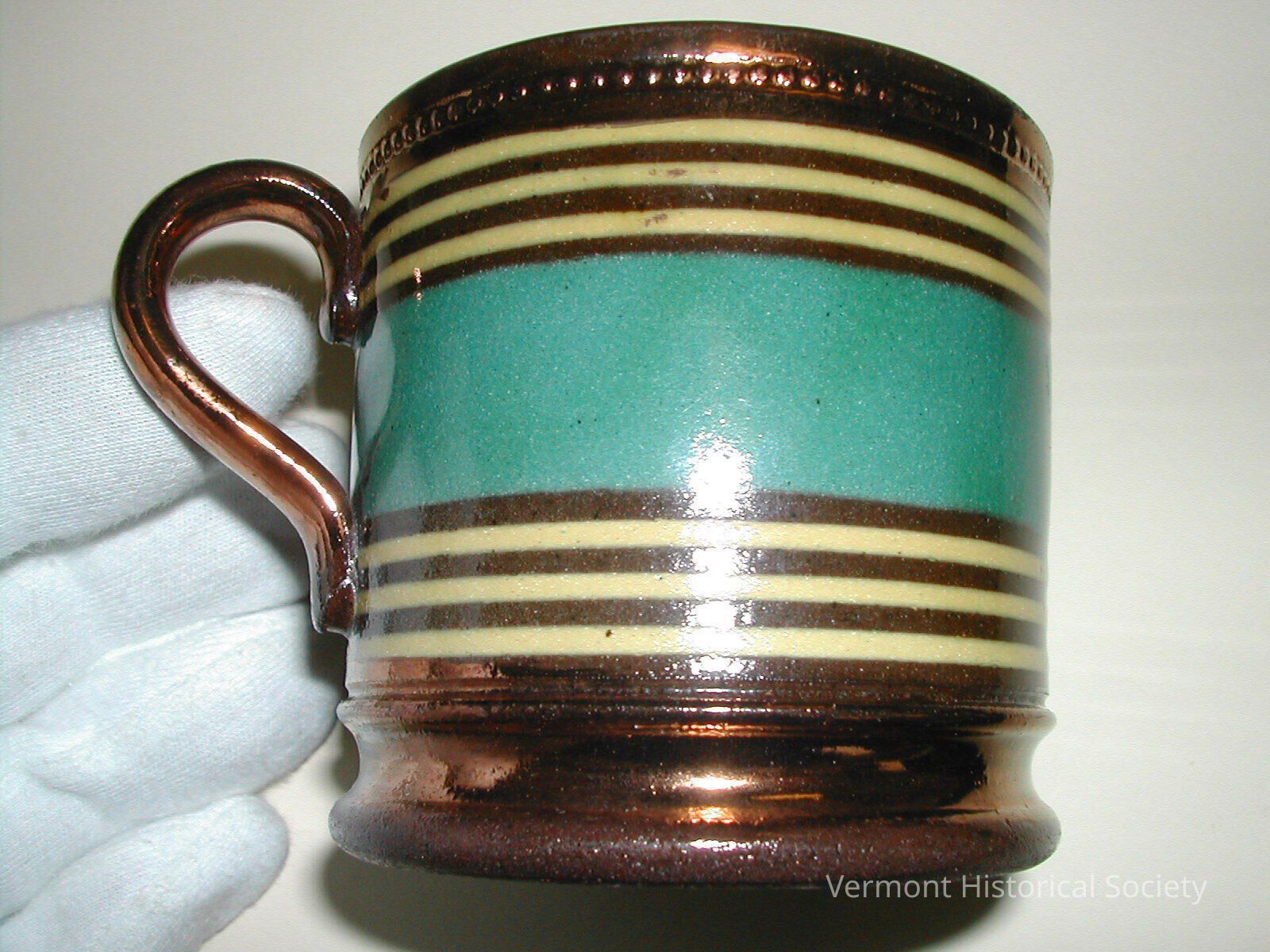 Small, straight-sided mug glazed with copper luster and banded around the center with a wide teal-colored stripe flanked at the top and bottom with three cream-colored stripes. The cup has beaded molded around the top rim, a molded base, and an ear-shaped handle.Context