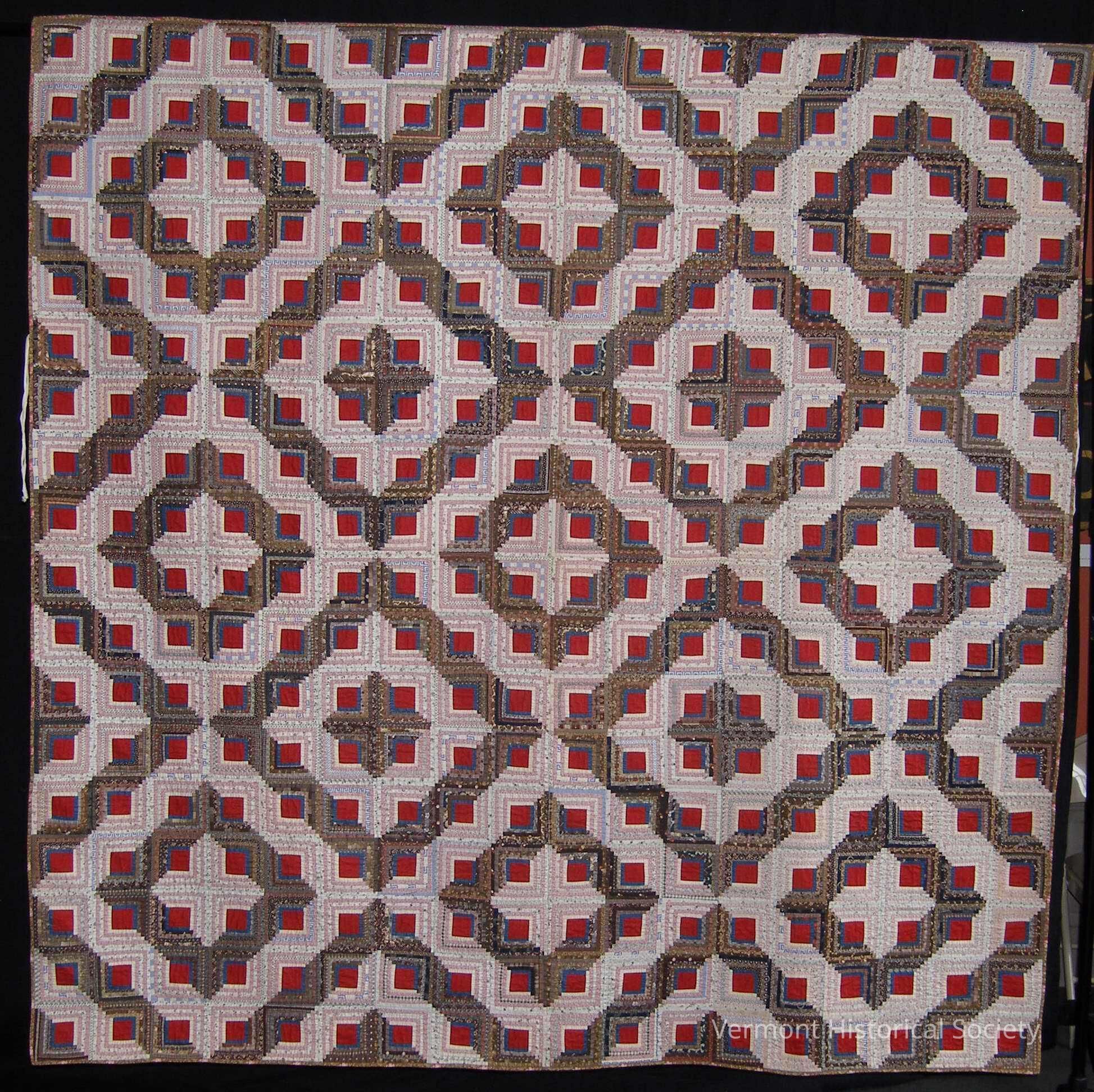 Large pieced quilt in a variation of a log cabin pattern. The pieces are laid out around red squares, with half the block in light colors and half in dark. The light colors are primarily white chintzes and calicos with small, pink flowers and sprigs. The dark colors are primarily brown chintzes with full-color flowers and sprigs. There are also black fabric with white dots, brown plaid, and dark blue. The blue is only used directly adjacent to the red squares. The back is lined with white glazed cotton calico sprigged with pink flowers, and the layers are only quilted together around the red squares. The edges are bound with brown cotton chintz with pink roses.Context
