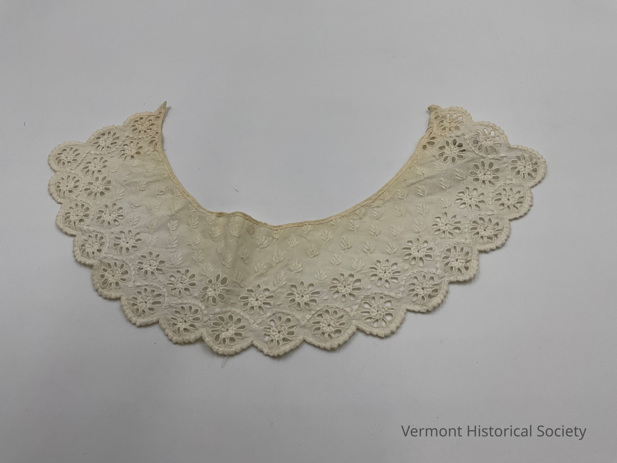 Semi-circular white cotton collar with eyelet embroidery. The outside edge is scalloped.