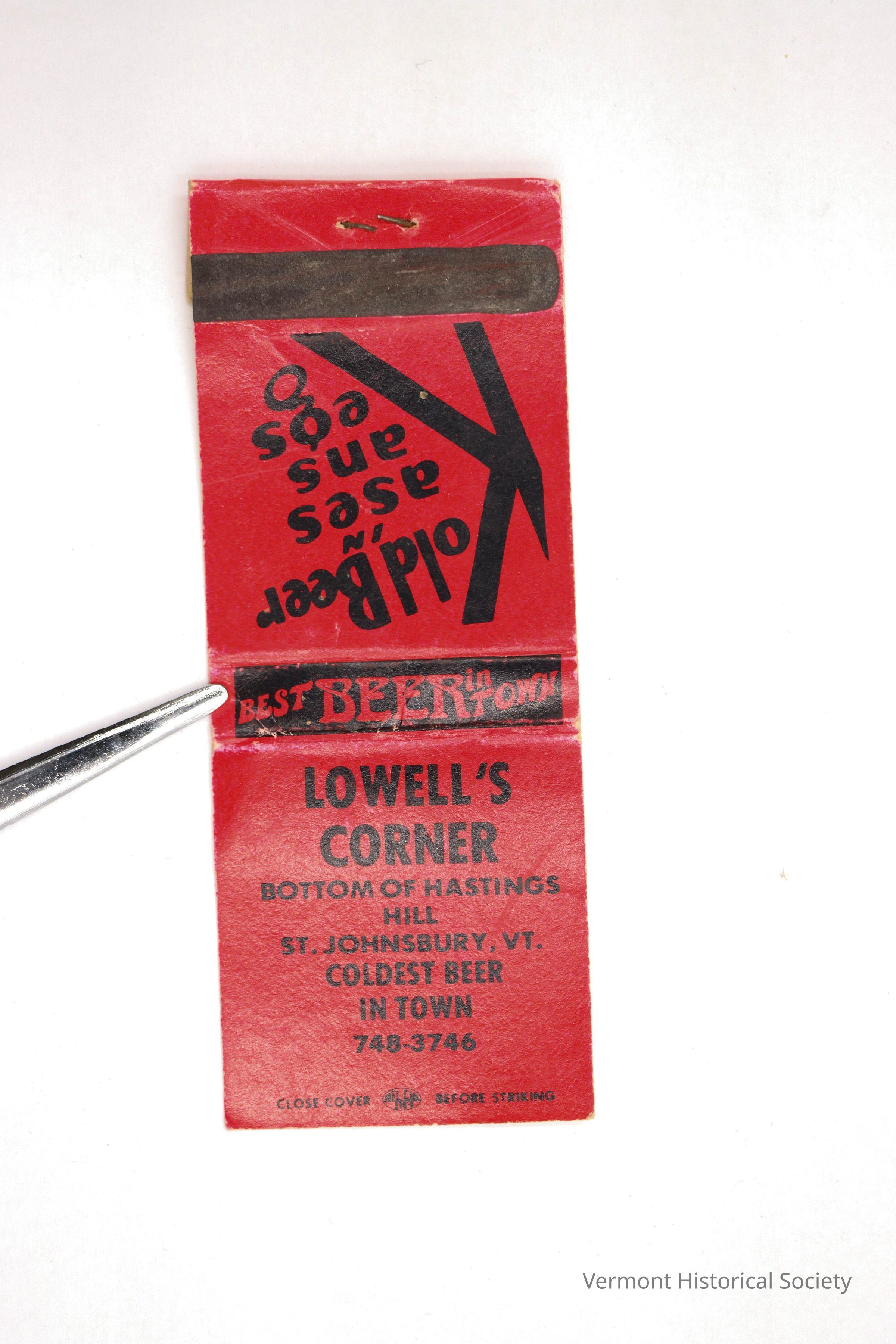Red cardboard bifold matchbook. The front flap is printed with the inscription, "LOWELL'S CORNER / BOTTOM OF HASTINGS HILL ST. JOHNSBURY, VT. COLDEST BEER IN TOWN 748-3746".