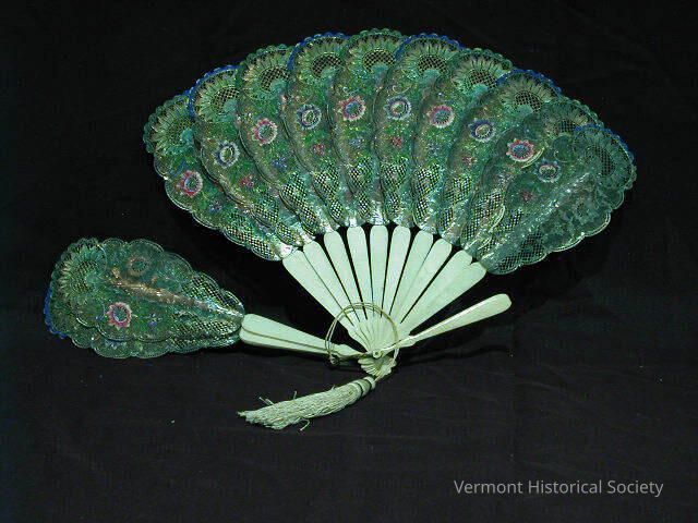 Folding hand fan with paper leaves and bone sticks. The leaves are made from silver paper stamp-cut into a doily pattern and painted with blue, green, pink, and white to emphasize the floral pattern of the stamp. There is a white tassel attached to the bottom of the fan.