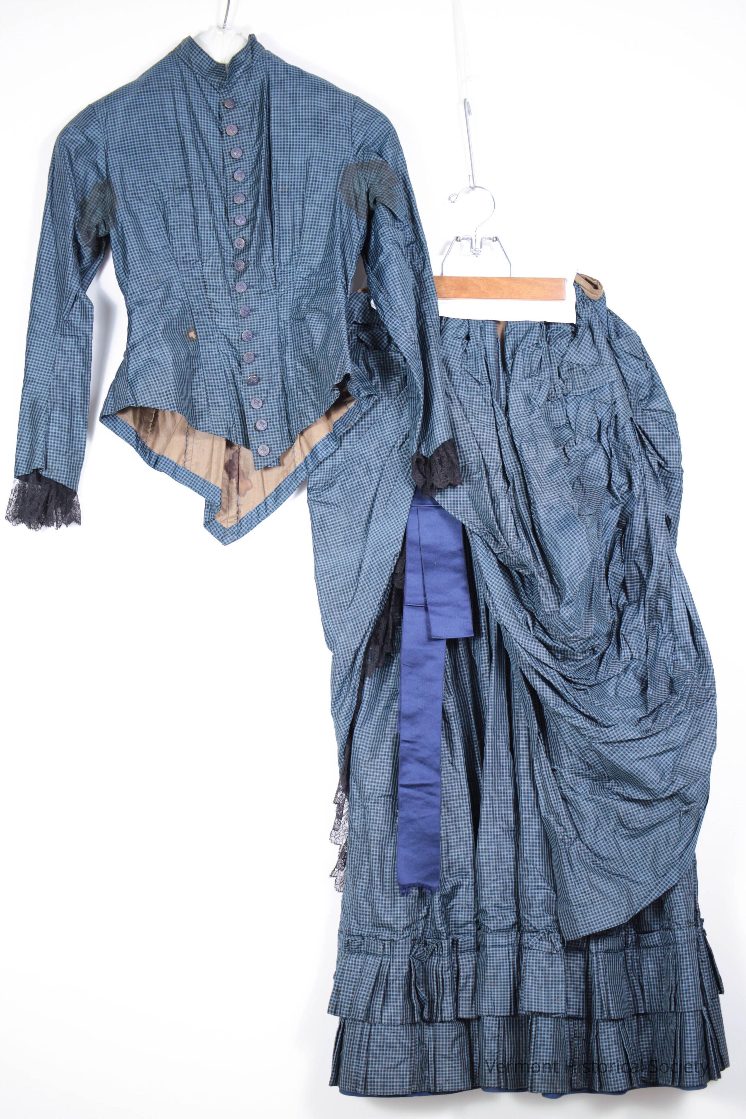 Two-piece blue-checked silk dress consisting of a bodice and skirt. The bodice has long sleeves with black lace cuffs and opens up the center front with 16 blue buttons. It is shaped to the wearer's body through four darts, and the hem is pointed. The skirt is made as a single piece attached to a cotton waistband, but is styled to look like a skirt and overskirt. The hem of the skirt is decorated with two rows of self-fabric knife pleats. The overskirt is gathered over a blue satin ribbon and hangs in swags over the back.Context