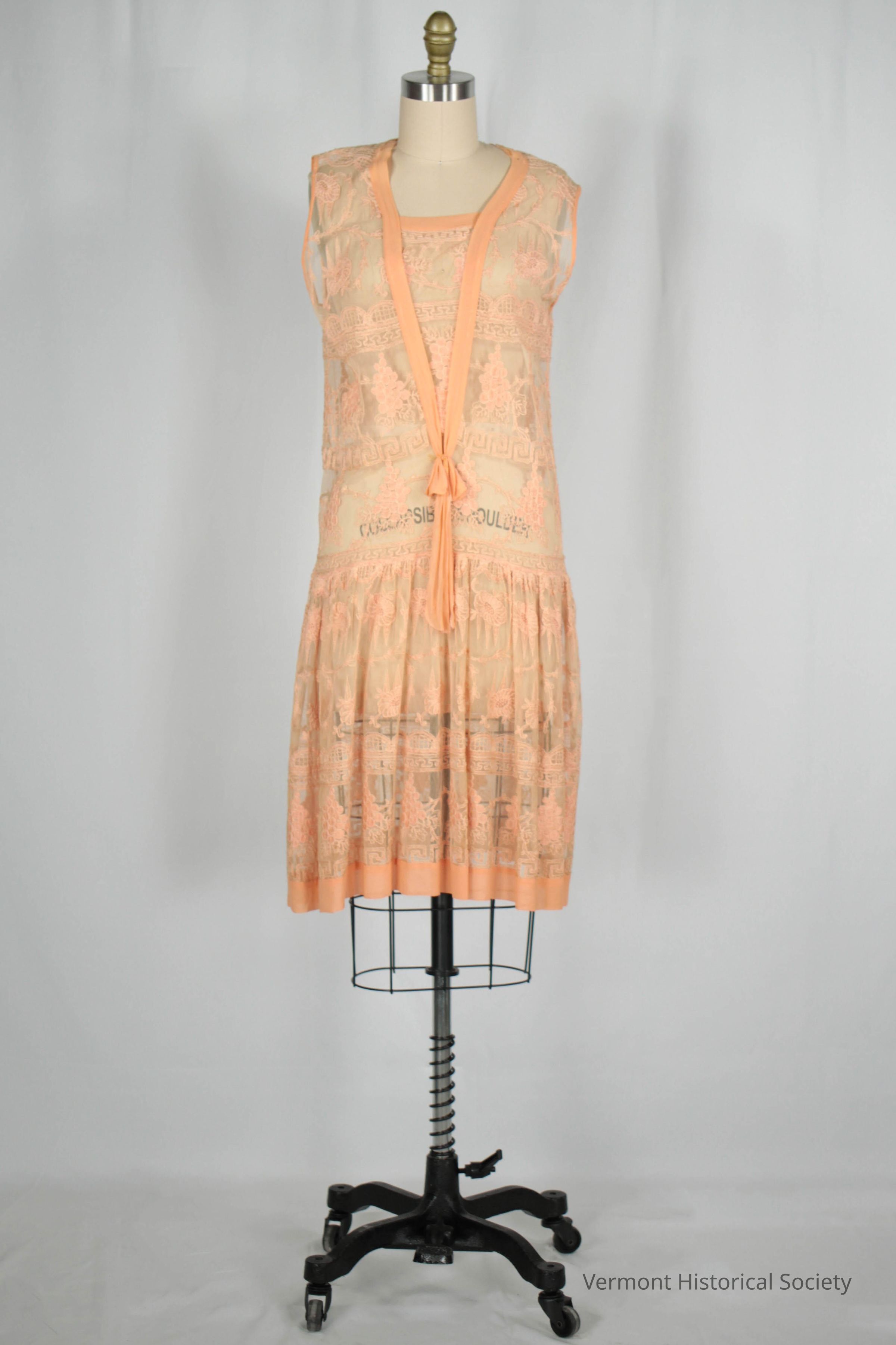 Salmon pink lace dress with no sleeves and a dropped waist. The dress has a square neckline with bands that extends in a V-shape to the waist, with a bow in the center. There is a triangular insert between the bands. The skirt is gathered into the waistline. The lace is machine-embroidered netting in a pattern of grapes, Greek keys, and flowers, arranged in horizontal lines.Acquisition