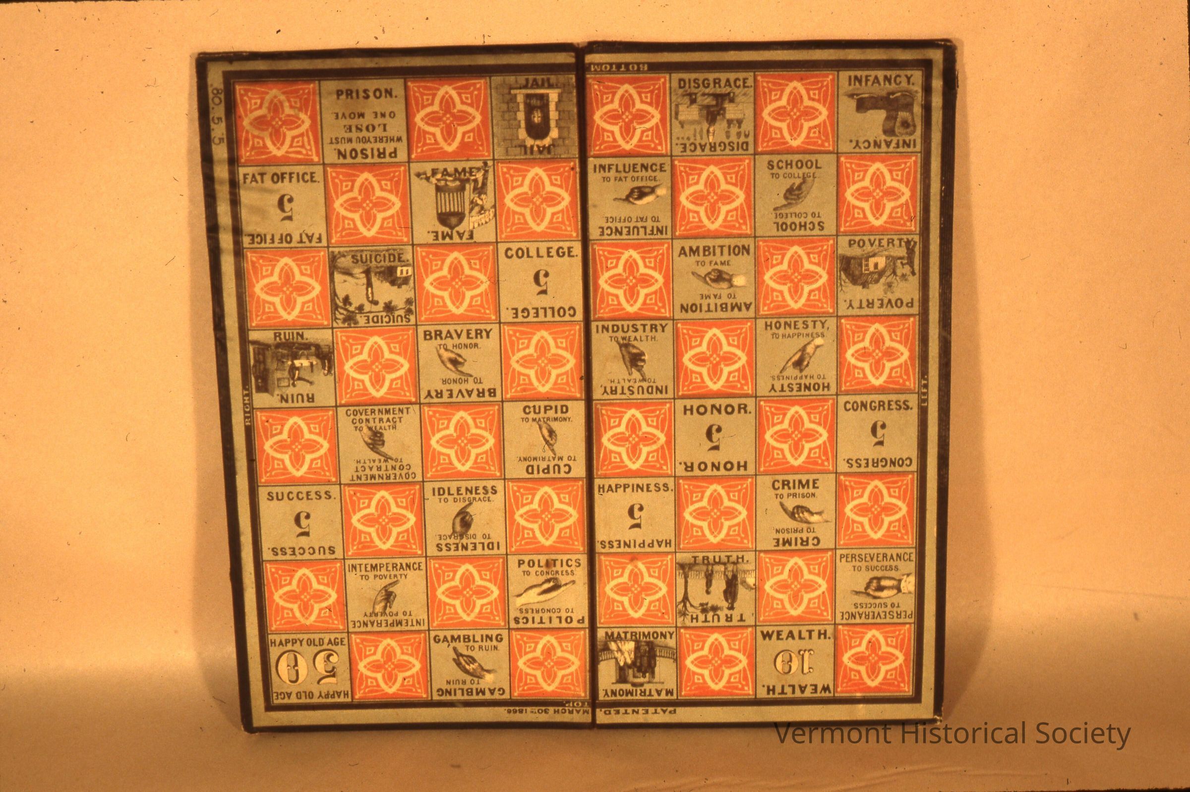 Paper-covered cardboard game board for "The Checkered Game of Life". The board folds in half down the center. The front of the board is printed in a checkered pattern, alternating red and blue squares. The red squares are all printed with a quatrefoil design, and the blue square are all printed in black with instructions and illustrations oriented towards to different sides of the board (for viewing by two players). Inscriptions include Prison, Disgrace, Jail, Infancy, Fat Office, Fame, Influence, School, Suicide, College, Ambition, Poverty, Ruin, Bravery, Industry, Honesty, Government Contract; Cupid, Honor, Congress, Success, Idleness, Happiness, Crime, Intemperance, Politics, Truth, Perseverance, Happy Old Age, Gambling, Matrimony, and Wealth.Context