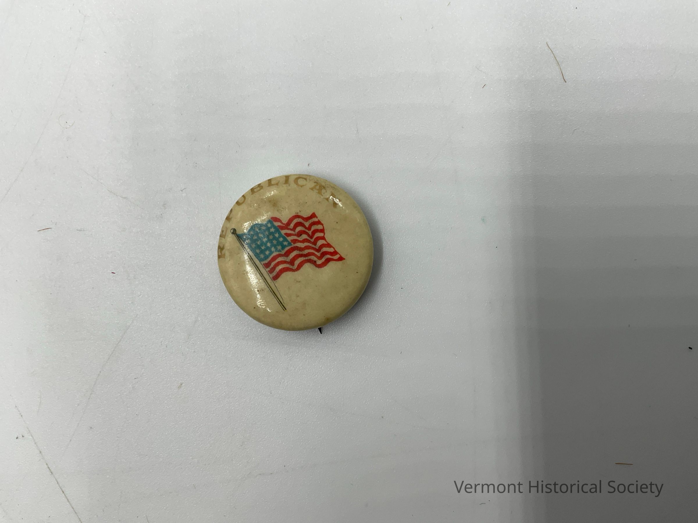 White pin with American flag in the middle and the word Republican across the topContext