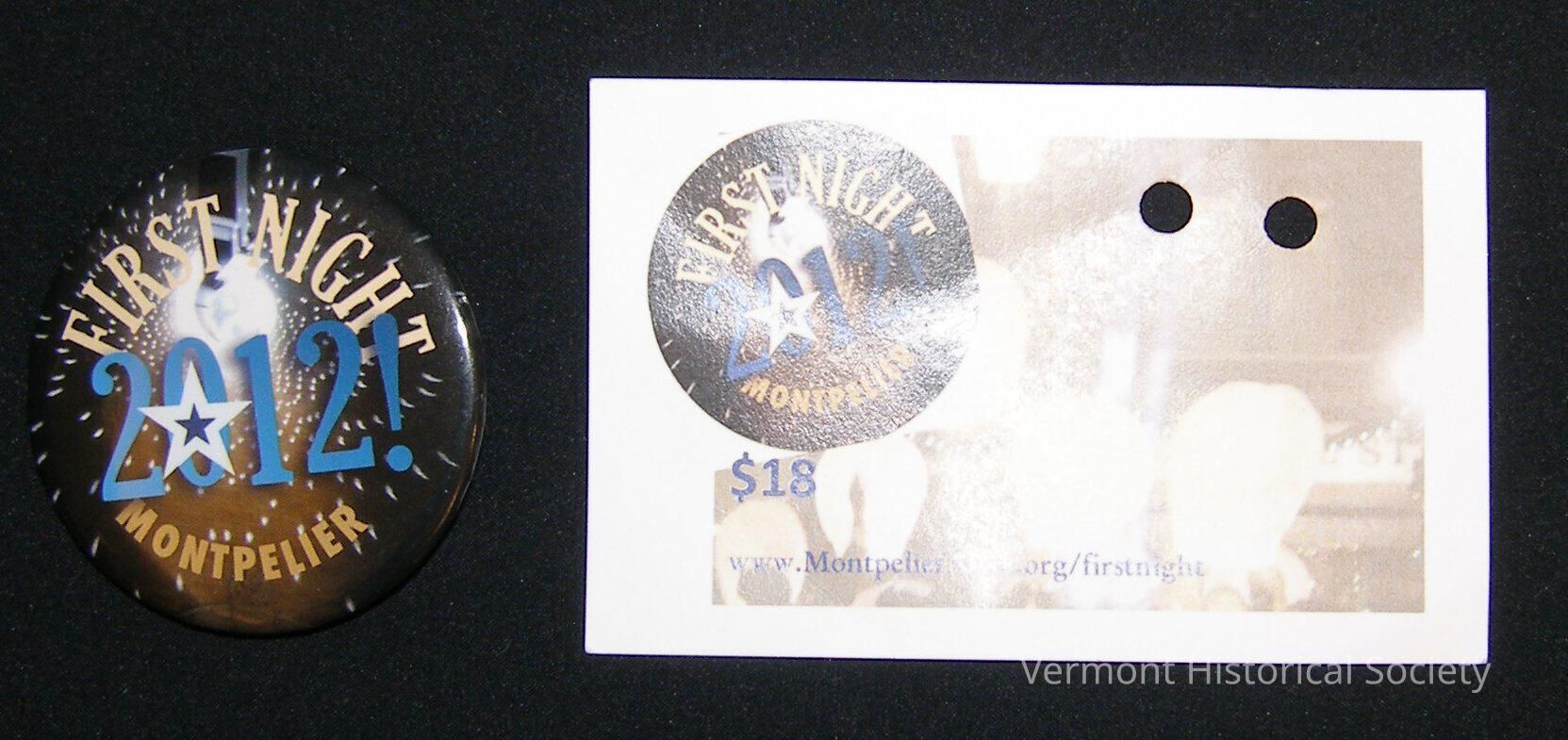Round black button with the inscription, "FIRST NIGHT 2012 MONTPELIER" over an illustration of a firework. It is accompanied by a rectangular piece of cardstock with an image of the button and spaces to fill out contact information for a raffle.Context