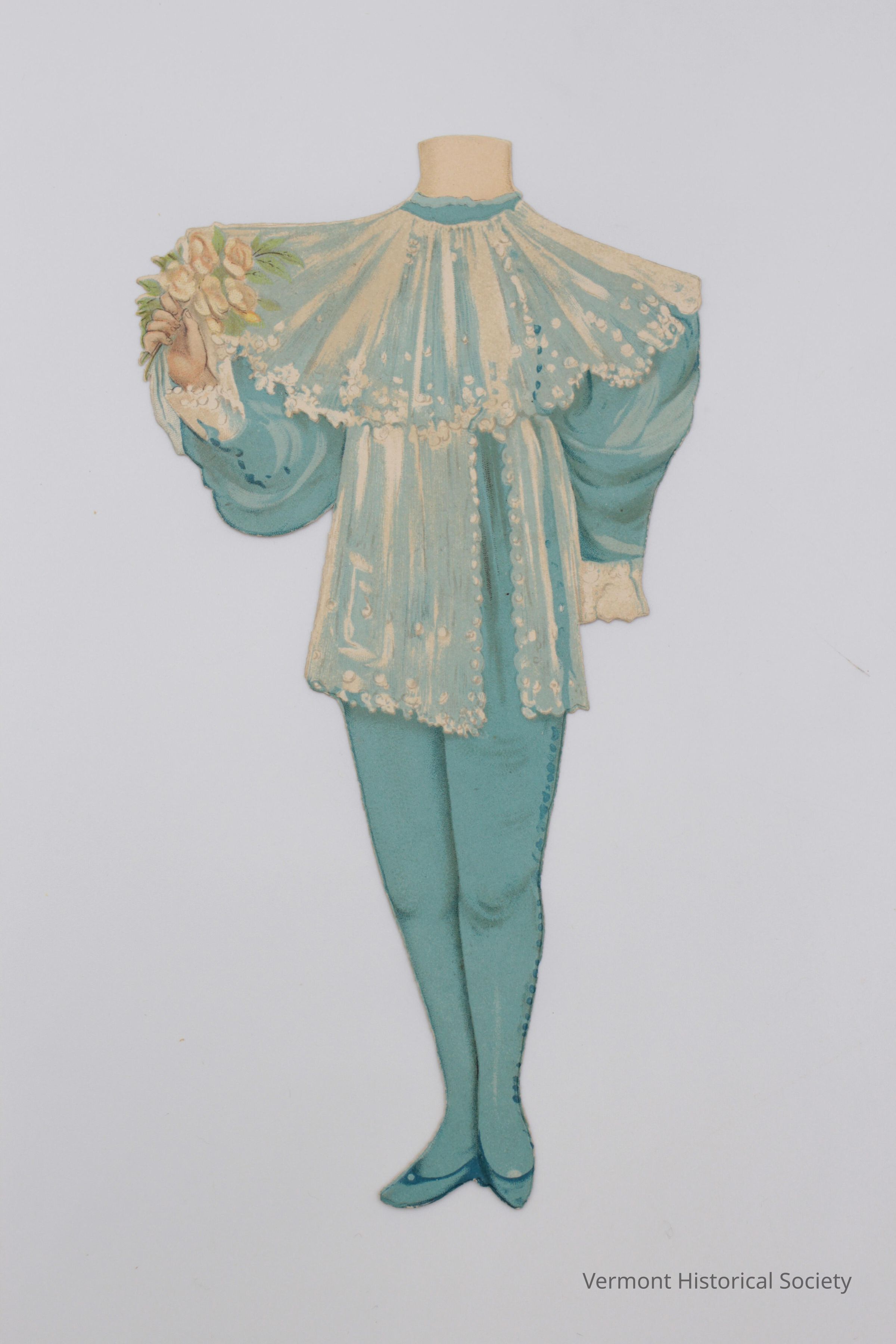 Light blue, stylized romantic costume for a young boy paper doll. It consists of a one-piece garment stretching from foot to neck with tight leggings and voluminous sleeves. Over that is a loose-fitting sheer white over-bodice with a wide, round collar. The right hand is holding a spray of pink roses.Context