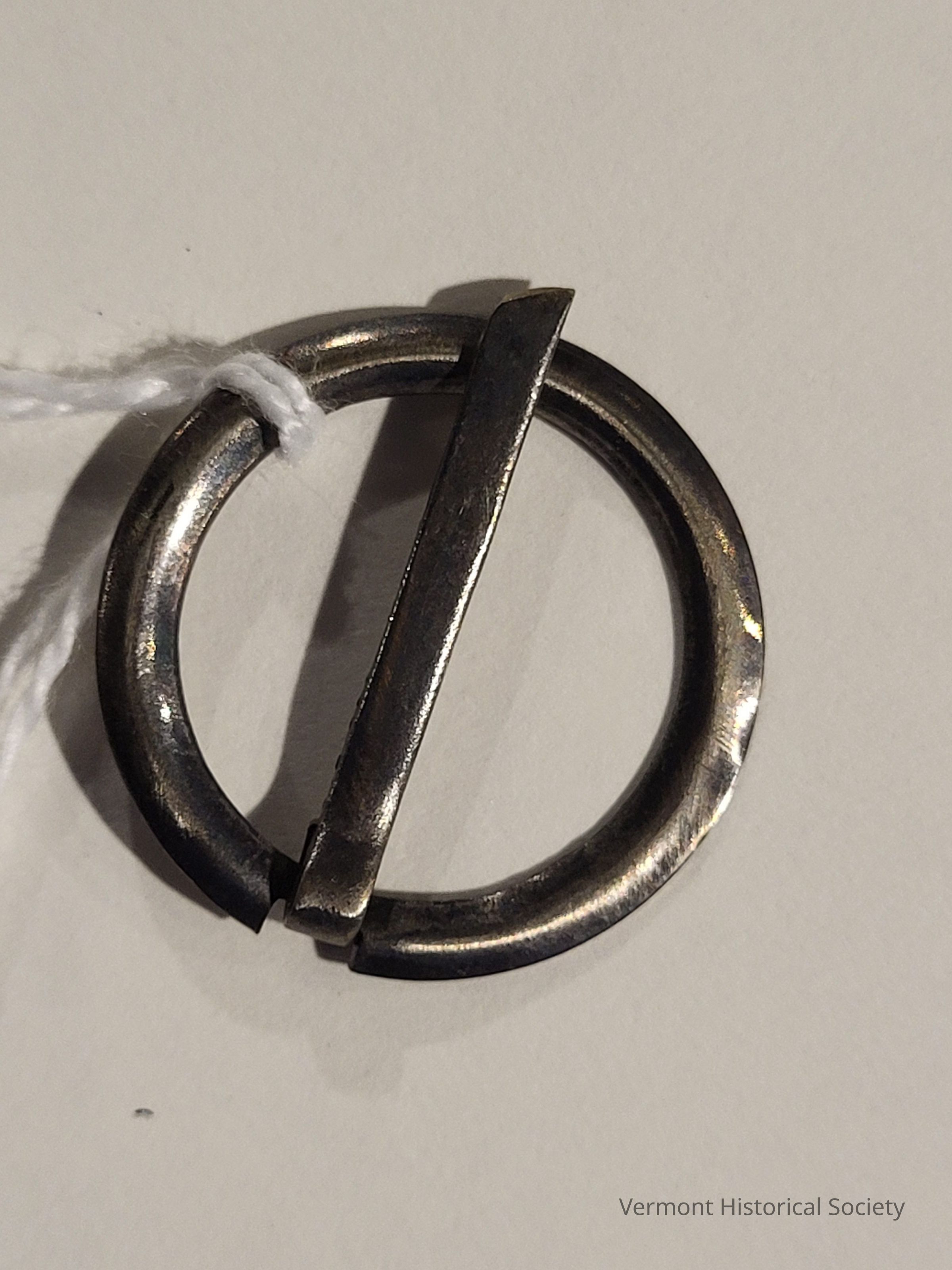 Wiseman states: This brooch, along with L2024.3.4 and L2024.3.6-8, were found in a Riker mount in the group shop, with a Western NH provenance and an assurance that they were solid coin silver and old. They were in almost pristine condition without much if any crinkling of the central prong. I worry that they were good repros, but they are not embossed “India” like many modern reproductions. They were full price, so I bought them for the provenance, but am unsure of their age, since trade silver is not my specialty.Acquisition