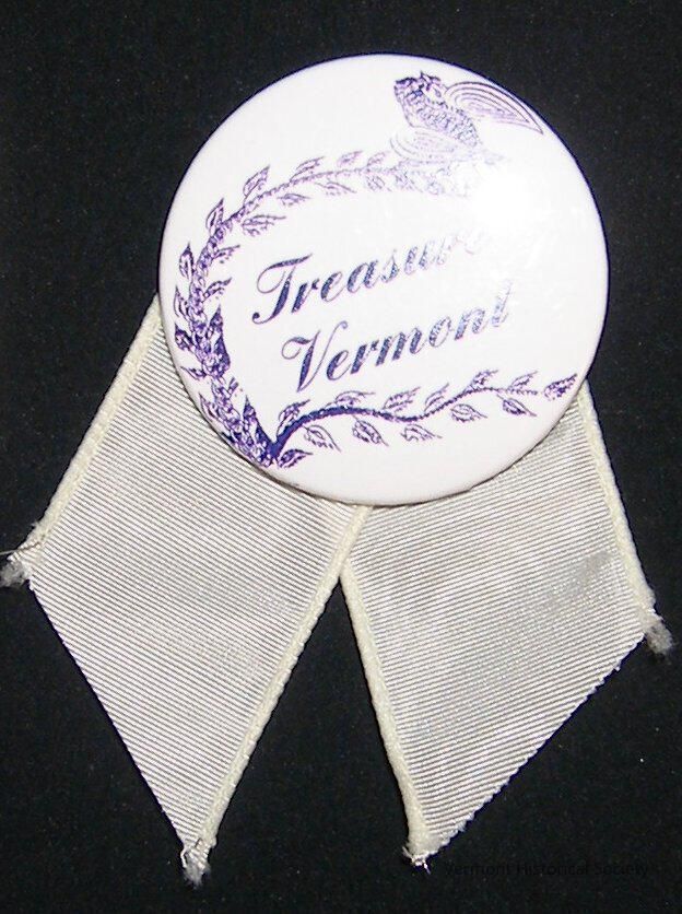 Round white button with a purple illustration of a curving branch with a folk-art style bird on the end and the inscription, "Treasure Vermont". There is a cream colored ribbon folded and pinned to the pin.Acquisition