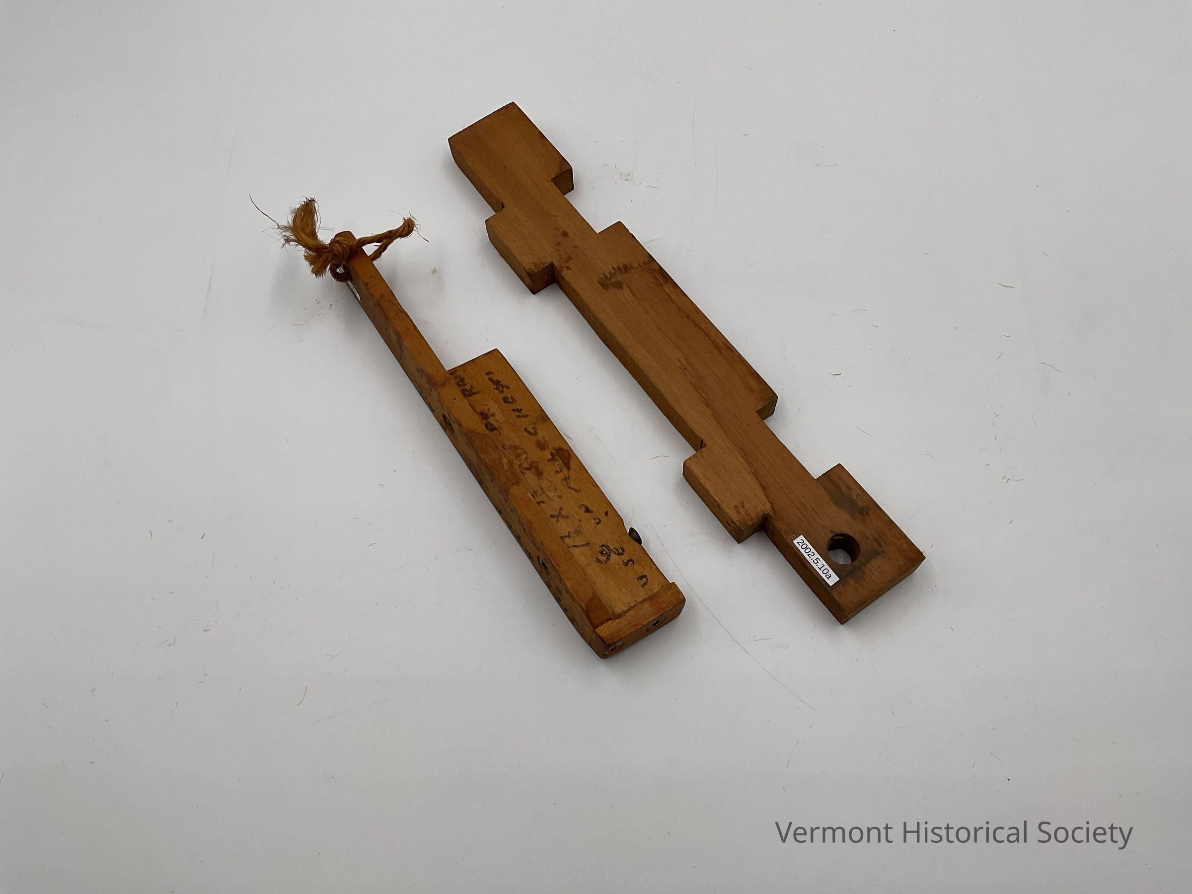 Two short wooden templates used in making furniture. One has a screw and says use for all chests, top back rail. The other is notched and just has a number written in marker on it.Context