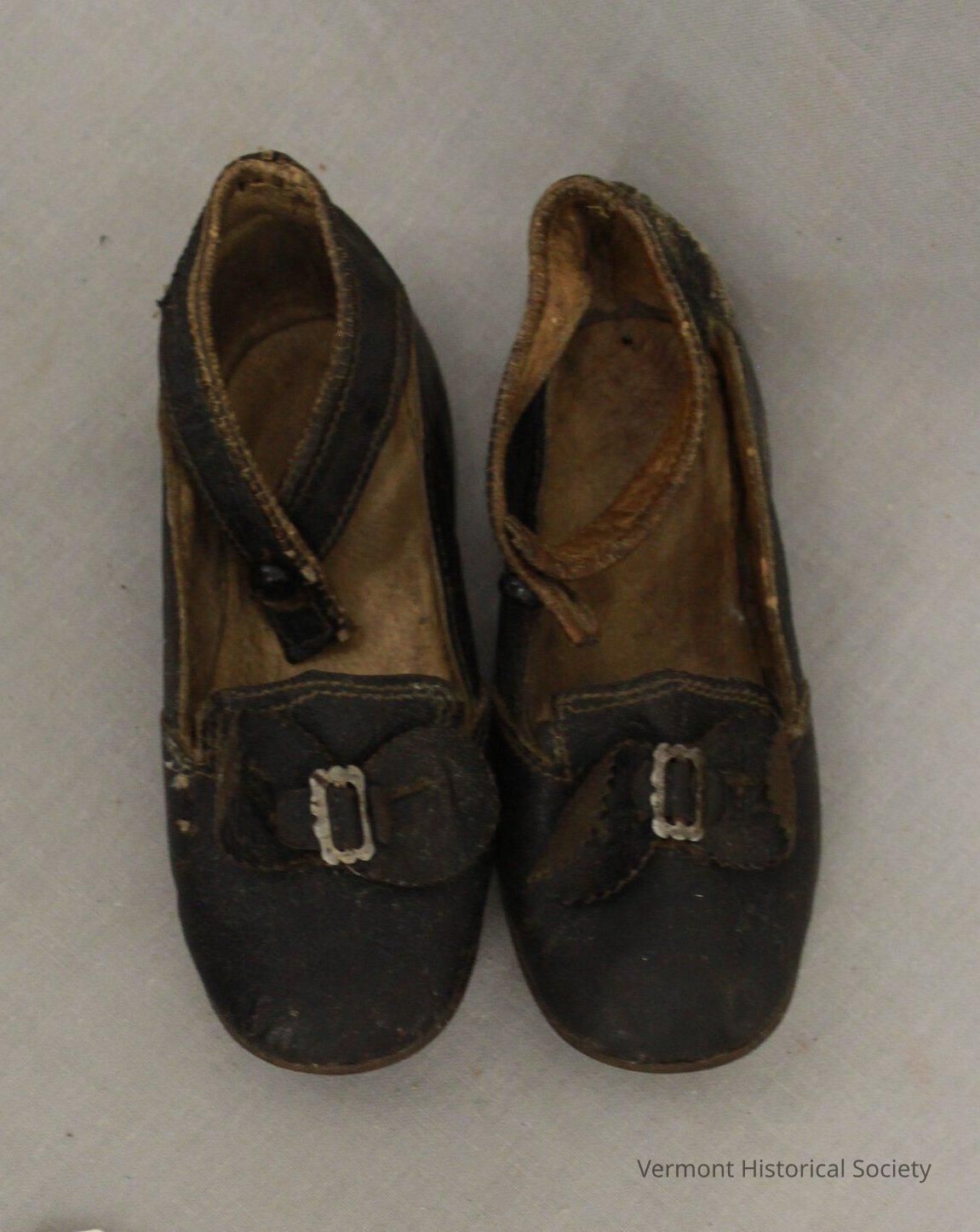Mary Jane style child's shoes. They are made of black leather and lined with undyed linen. There is a short, decorative tongue at the front, and a strap that buttons over the wearer's ankle. There is a small, decorative bow at the toe with a rectangular metal buckle. The numeral "4" is stamped on the sole of each shoe.Context