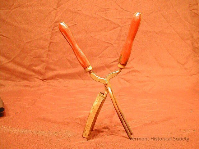 Metal curling iron with double-wave. The curling iron consists of two parts attached at the center like scissors. The handles are red wood. The curling side has a waved or crimped metal plate on one side and two metal rods on the other side.