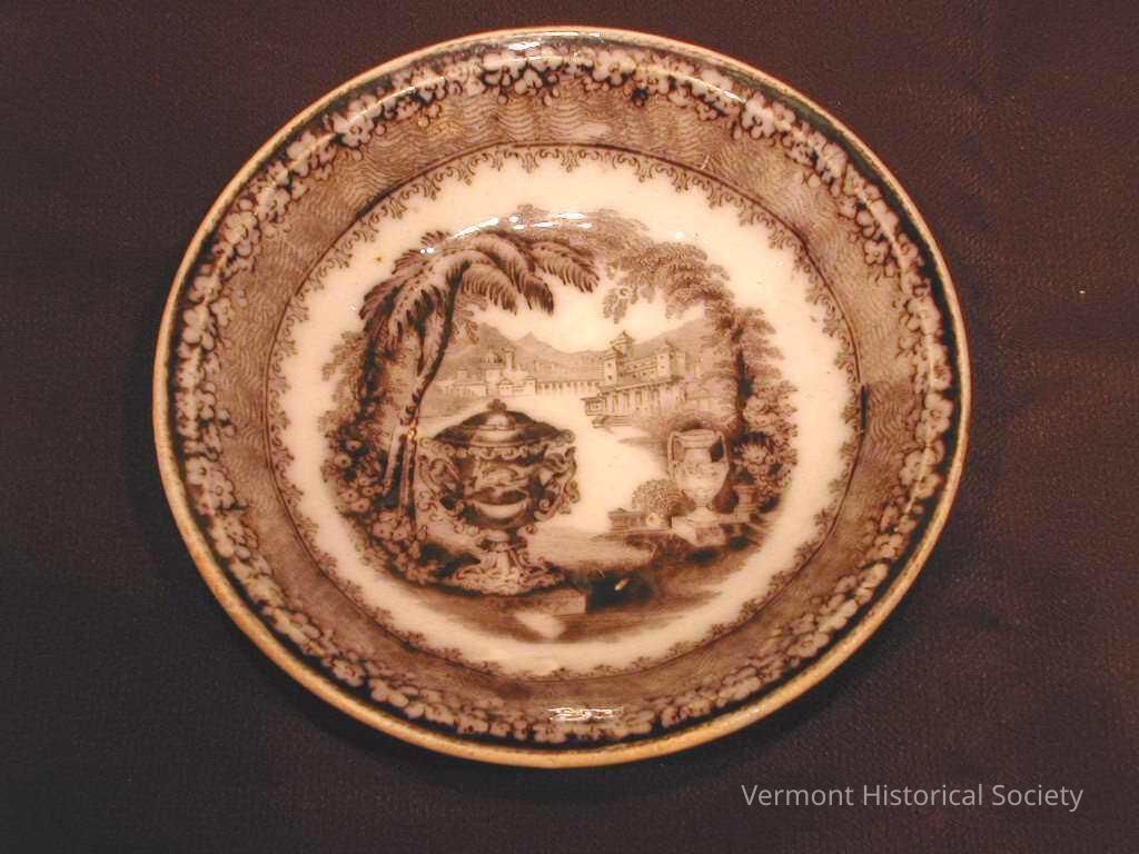 Black and white transfer-printed saucer. The border has a design of small flowers and wavy lines. The center has a scene of a large covered urn in front of a body of water with castles in the background. The back is marked, "WASHINGTON VASE / PEARL STONE WARE / PWUC"