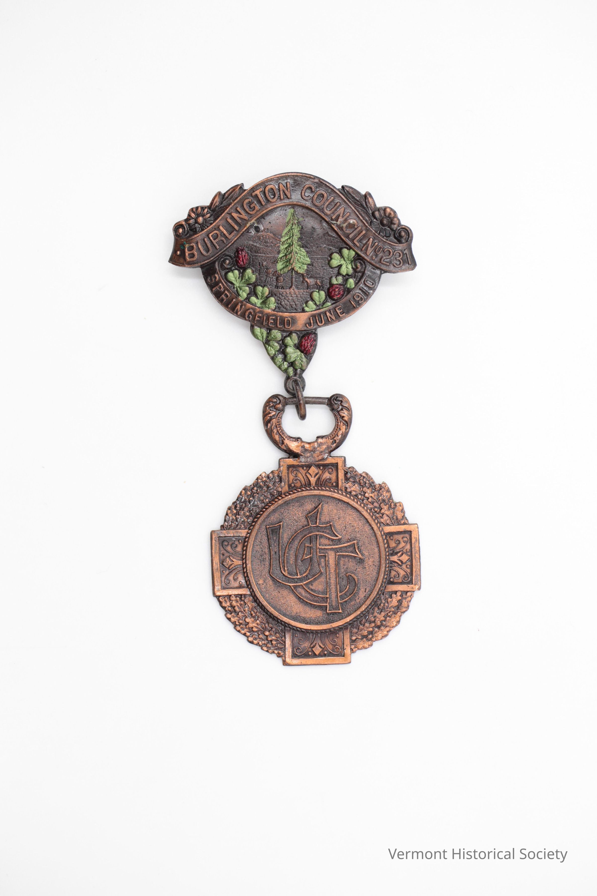 Membership badge consisting of two parts. The upper portion consists of the the seal of the State of Vermont surrounded by banners that read, "BURLINGTON COUNCIL No. 231" on the top and "SPRINGFIELD JUNE 1910" on the bottom. The green in the tree and clovers and the red in the clover flowers are enameled. The lower portion consists of a round medallion surrounded by a wreath with the letters "UCT" in the center. The lower portion hands from the upper portion with an eye ring.