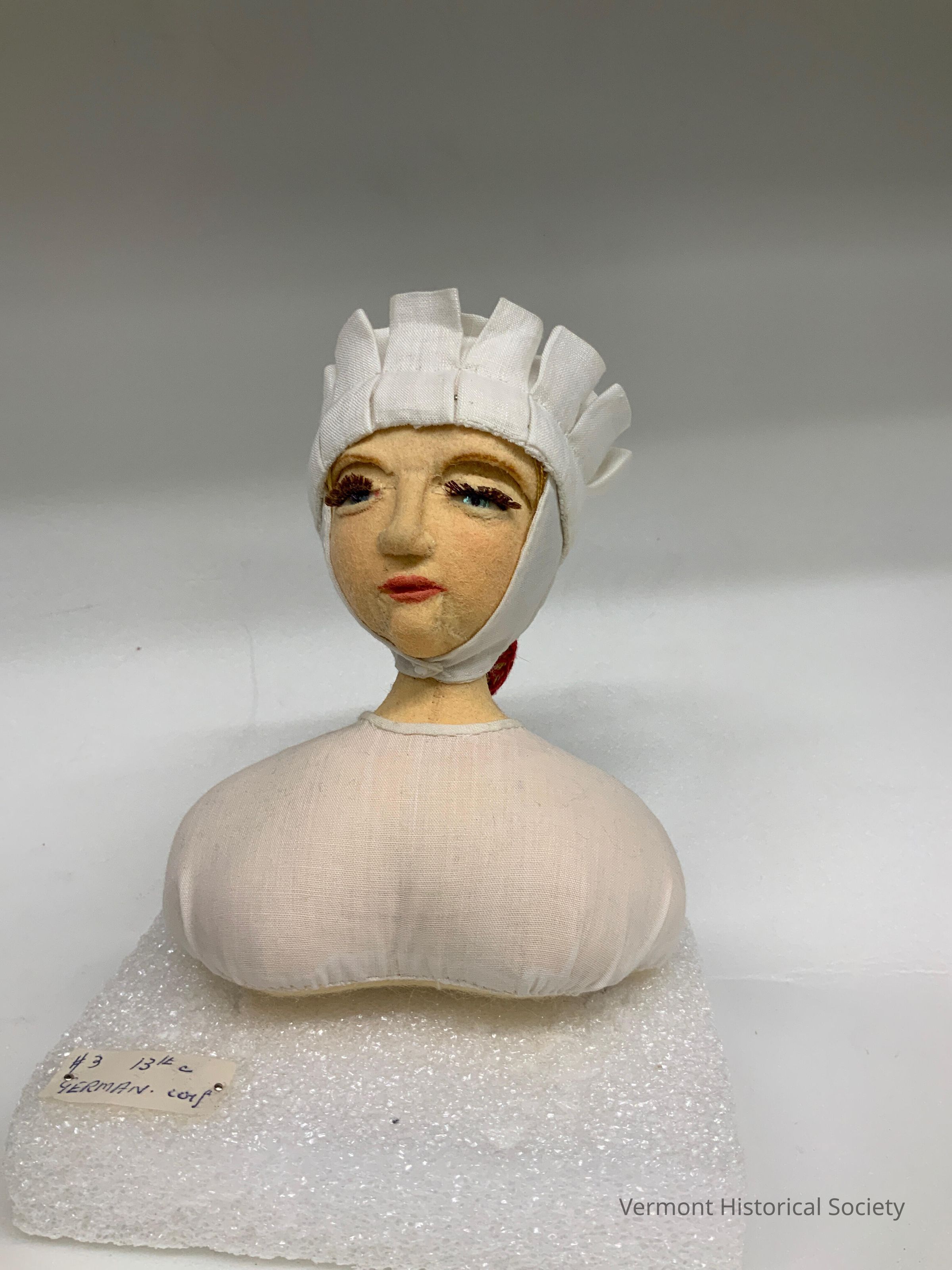 The bust is wearing a headdress consisting of a tightly fitted white cotton cap pinned under the chin with a box-pleated topper, similar in appearance to a crown. A low bun held in a red net sticks out from the bottom of the cap.