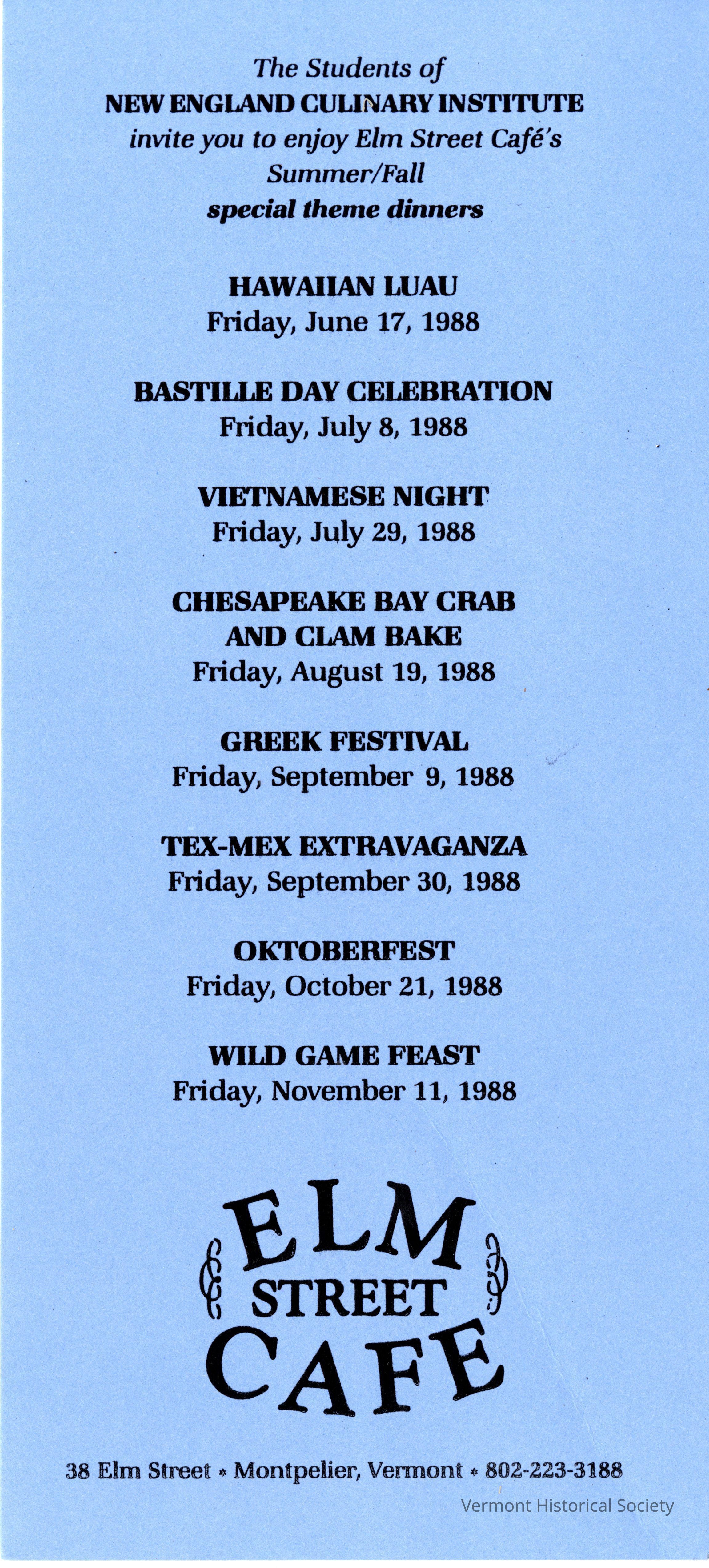 Menu for special dinners at the New England Culinary Institute's Elm Street Cafe