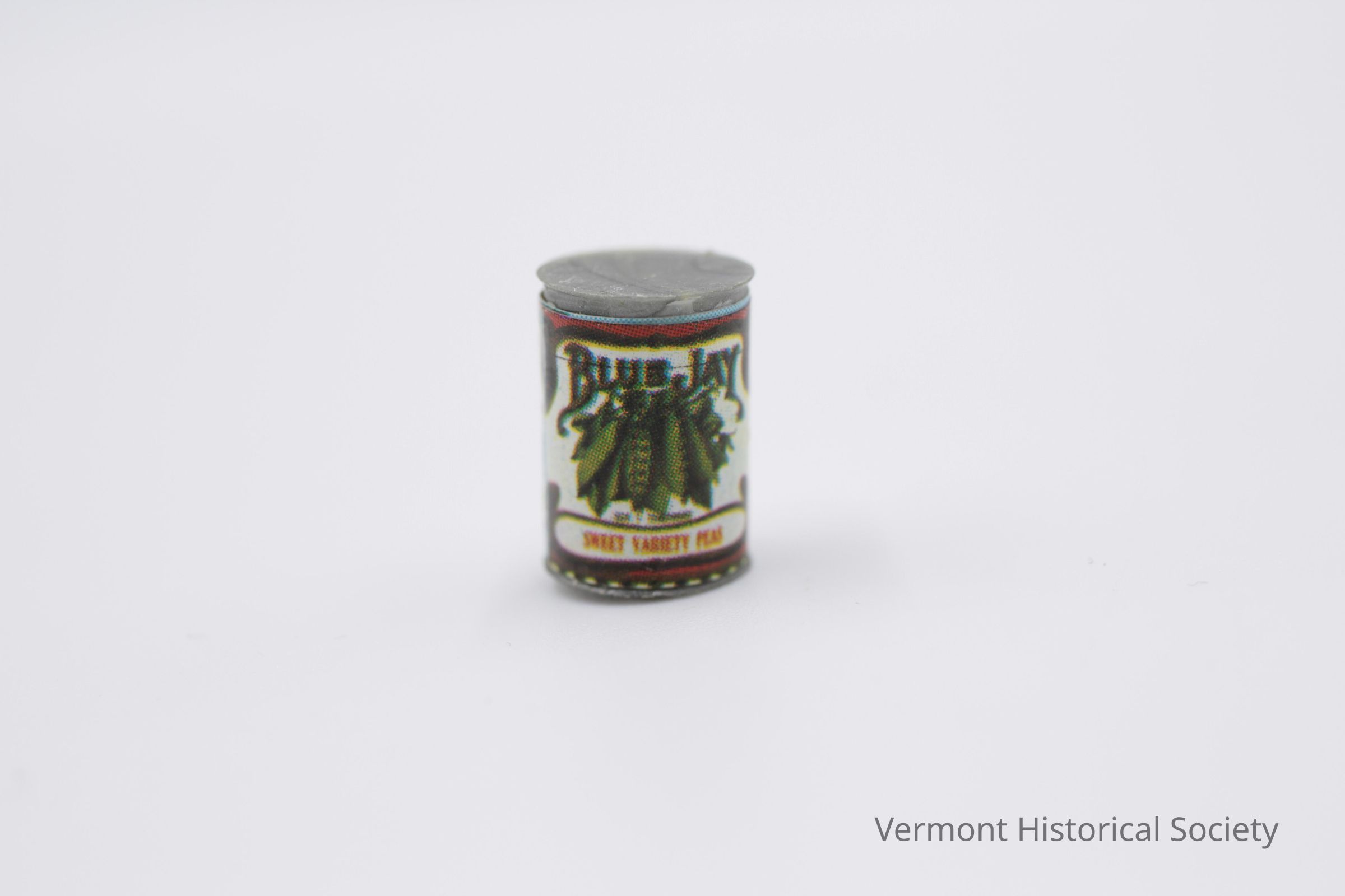 Miniature cylindrical food-storage can. The can is made of silver-colored plastic and is wrapped with a printed paper label. One side of the paper label shows a bunch of pea pods with the words, "BLUE JAY SWEET VARIETY PEAS". The other side shows a bird with the words, "BLUE JAY".Context