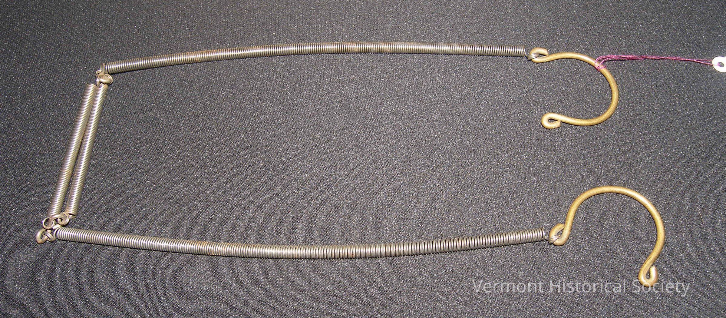 This is a bottle holder branded as "Mothers Helper." It consists of a series of springs that are attached to the side rails of a baby's crib. By placing a feeding bottle, pacifier, or toy in the center springs, it can hold the object in place above the baby. The hooks located at either end of the device appear to be made of brass.