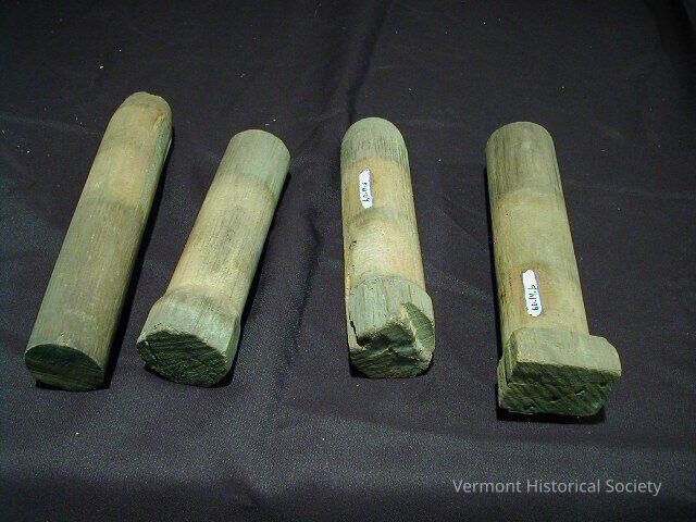 Four wooden treenails. All the treenails are cylindrical. Two have wider, circular heads, and one has a square head.Context