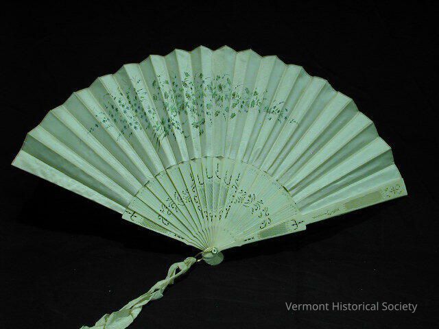 Silk hand fan with carved ivory sticks. When expanded, the carving shows a cartouche surrounded by swirls. The white silk leaf is decorated with painted floral spray containing daisies, forget-me-nots and rose buds. There is a white ribbon tied to the hande.