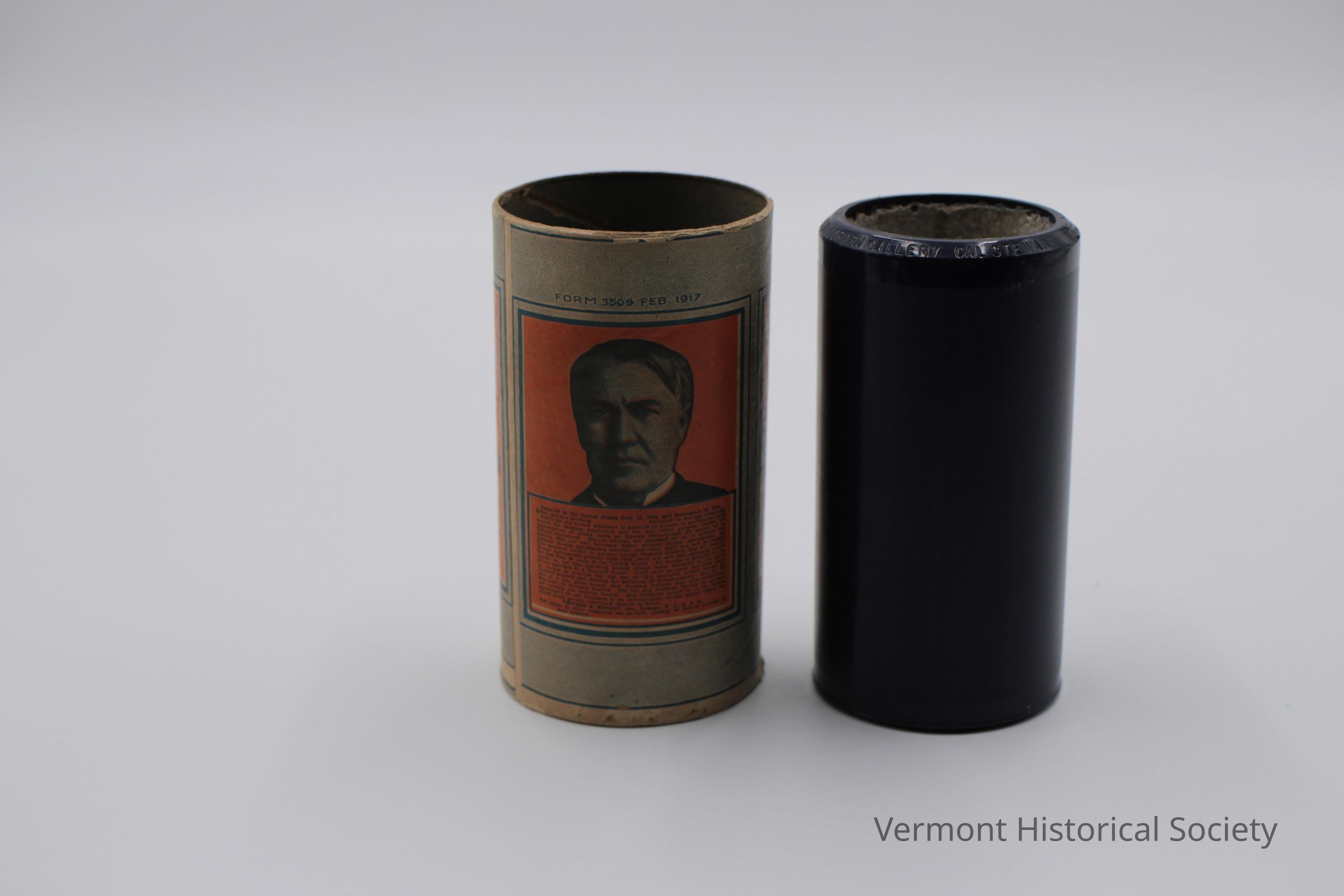 Black phonograph cylinder with a cardboard case. The cylinder, or "record", is a hollow cylinder consisting of hard, blue, ridged celluloid around a concrete core. One edge of the cylinder is labeled in white with the words, "2105 UNCLE JOSH IN A PHOTOGRAPHY GALLERY CAL STEWART / Thomas A Edison PAT'D. 24."Use