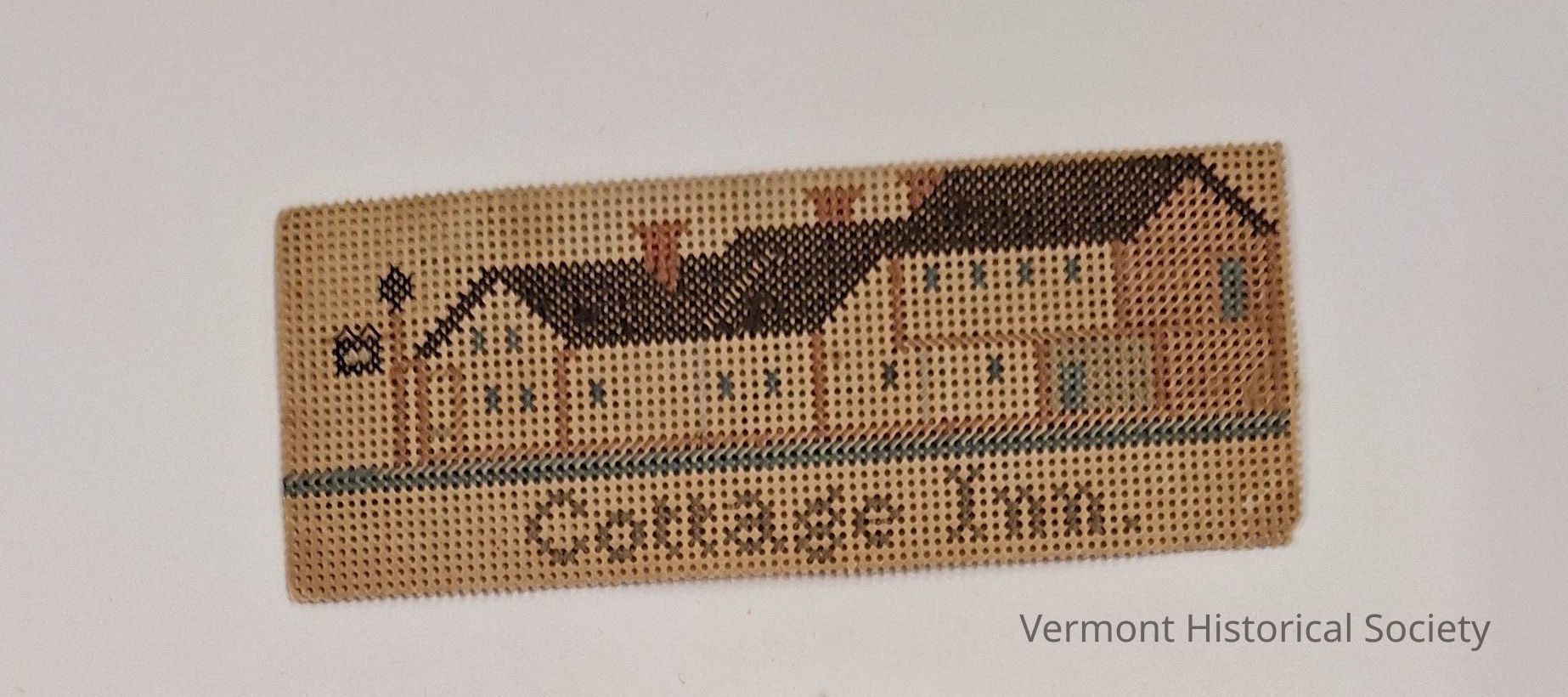 Two small cross-stitch examples on paper. The first (a) is a horizontal rectangle showing a sprawling building with slate roof, brick chimneys, blue windows and doors, and a signpost at the far left edge. Below the image are the words "Cottage Inn." in cross-stitch. The second (b) is a vertical paper cross-stitched with a floral spray and the word "Hope." below it. The paper is mounted to a striped polychrome silk ribbon.Context