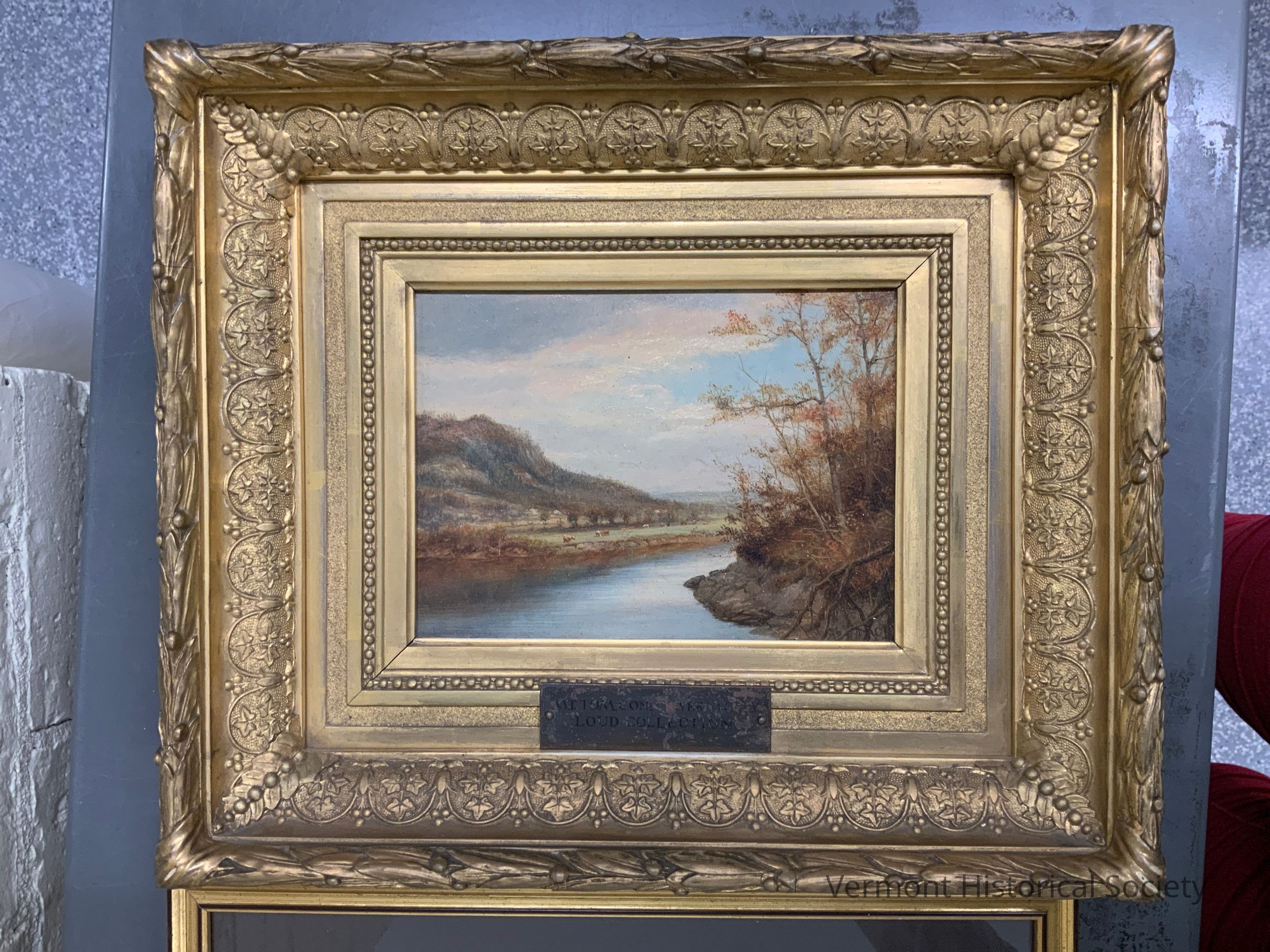 Oil on canvas painting of Mount Tom by Charles Franklin Pierce. The painting features a blue sky with wisps of darkened clouds that lighten as they pass over the peak towards the river. The landscape shows a fall scene, with scattered orange and brown leaves on the trees and a pale green field on the far bank of the river. The painting is set into a carved gilt gesso frame.Type of Painting