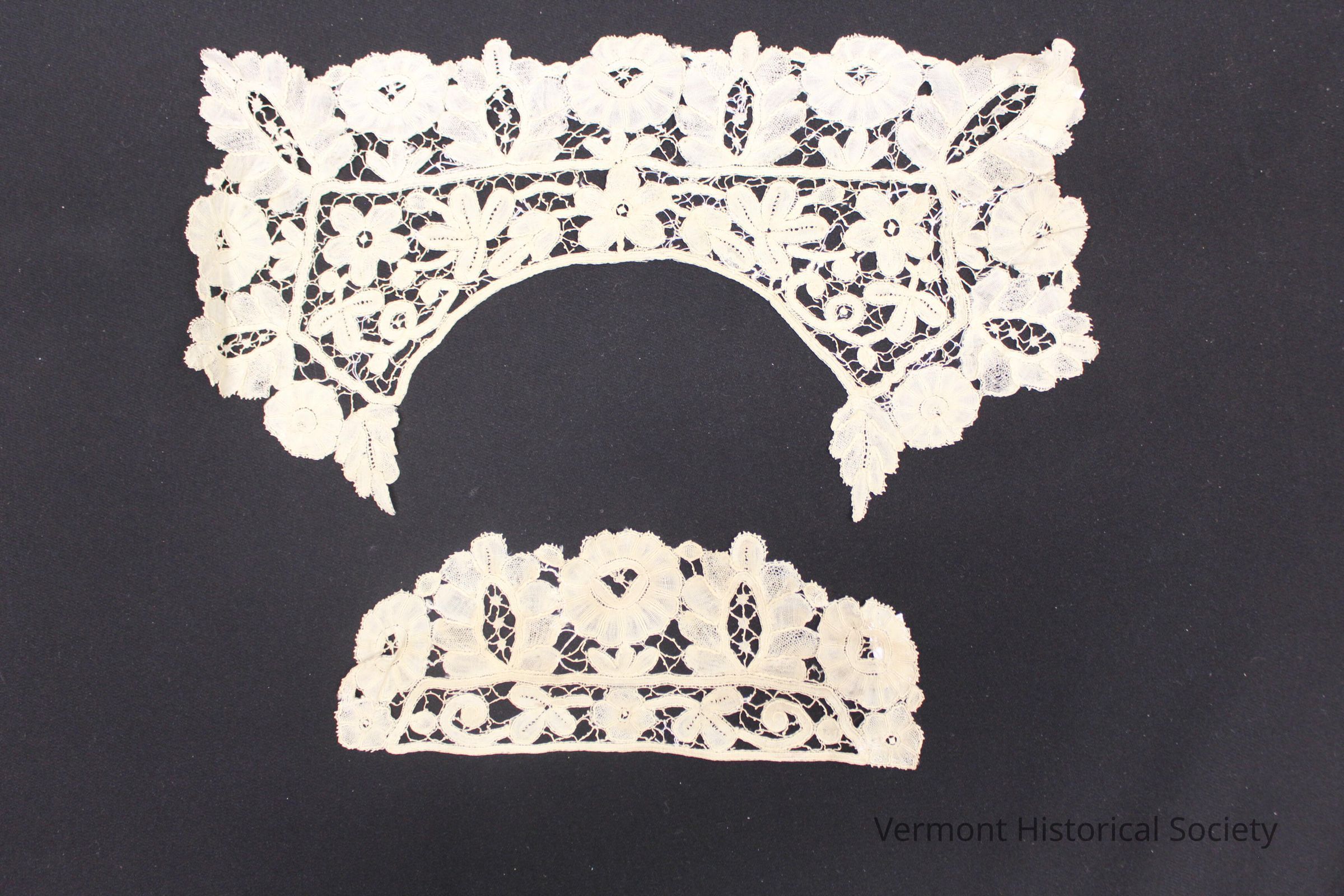 Lace collar and cuff pieces. The lace is in a large-format floral design. The collar is square, and the cuff is situated along a rectangular band.