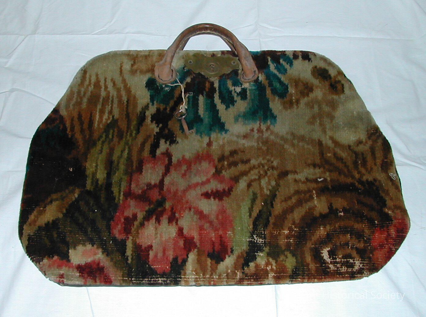 Large bag of cut-pile wool-tufted canvas with a large-format floral pattern. The bag opens at the top with an interior wooden frame that hinges on either side and latches close in the center. Over the latch on the front of the bag is a metal escutcheon with a keyhole. Two short leather handles are at the center of the opening. A metal key is tied to one of the handles. The interior of the bag is lined with glazed, plain-woven white cotton. The inscription, "CC Upham" is painted on the base.