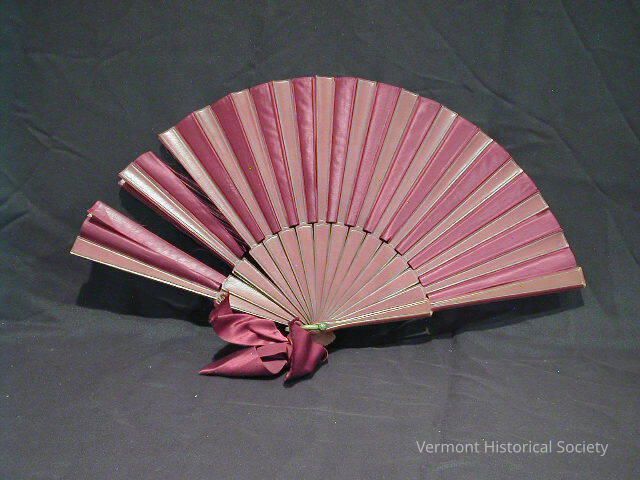 Folding hand fan with a burgundy silk leaf and burgundy-painted wooden sticks. There is a silk ribbon attached to the base.