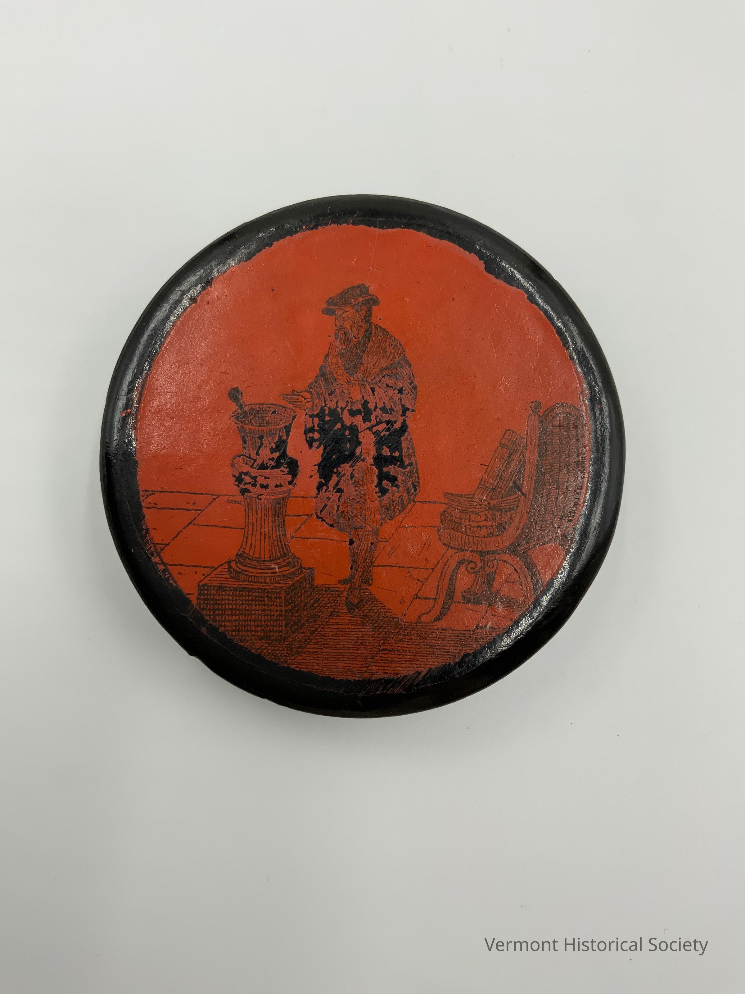 Round, papier-mâché snuff box. The top is painted orange and printed in black with an image of a man standing near a large mortar and pestle on a pedestal. There is a chair filled with books placed near him.