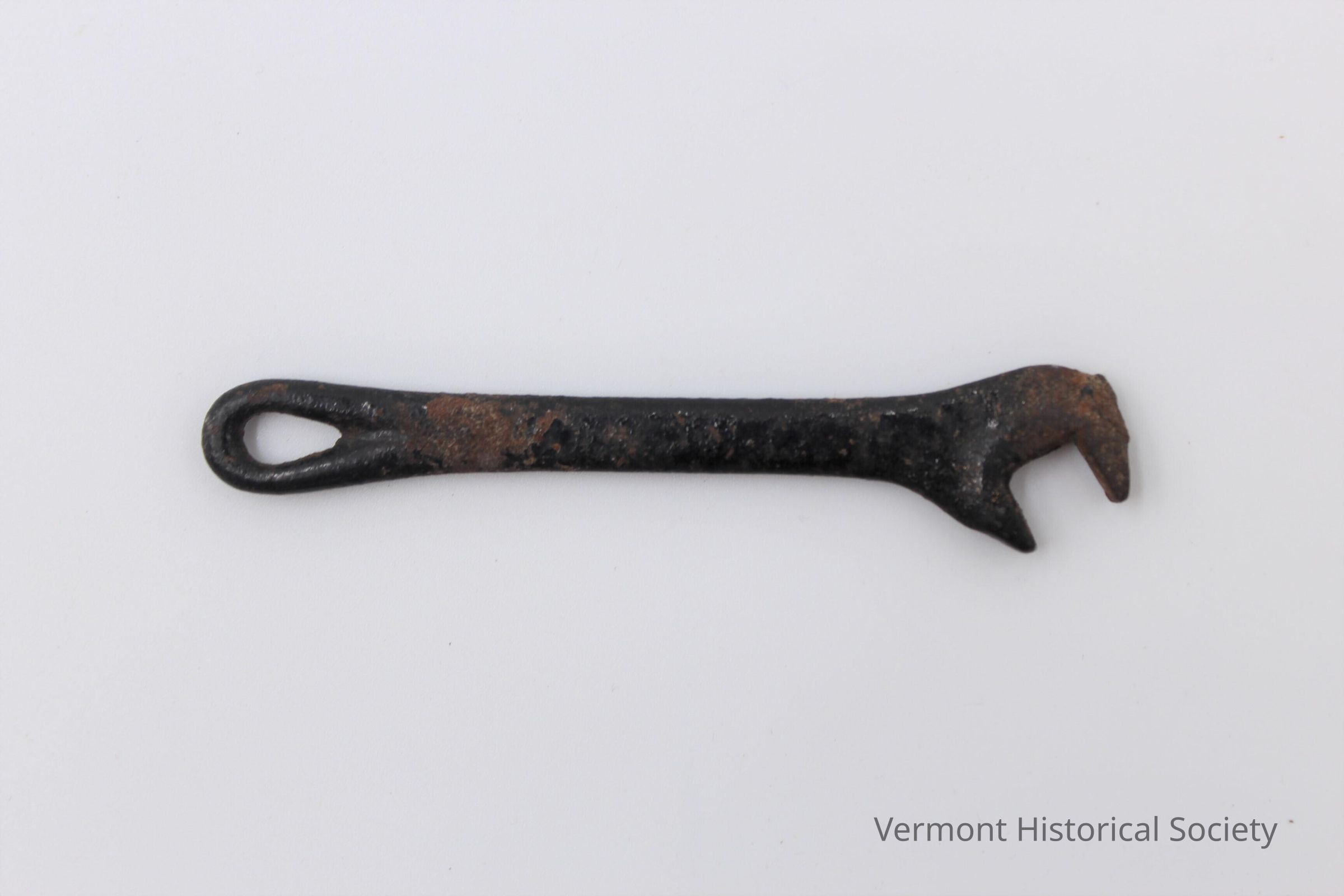 Black metal wrench with a loop at the end of the handle and a square jaw.