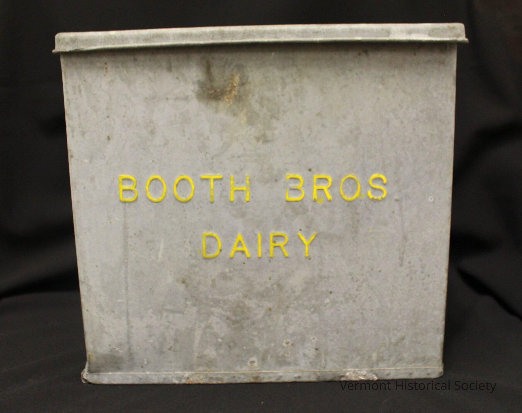 Insulated metal box with a hinging top lid. The lid hinges upward from two strap hinges on the back edge. Though the lid is not insulated, the rest of the interior is lined in white styrofoam. The front has the inscription, "BOOTH BROS DAIRY", in raised, yellow letters.Use