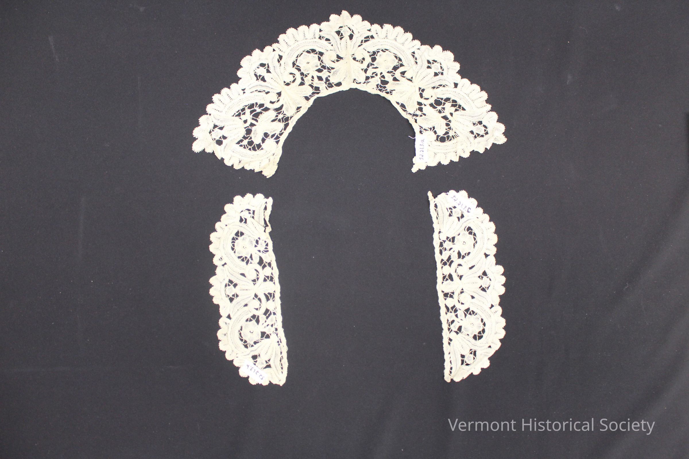 Lace collar and cuff set. The lace is in a floral rococo revival pattern. The collar is round. Both the collar and cuff are formed along narrow borders. The collar is reinforced with boning at regular intervals.Context