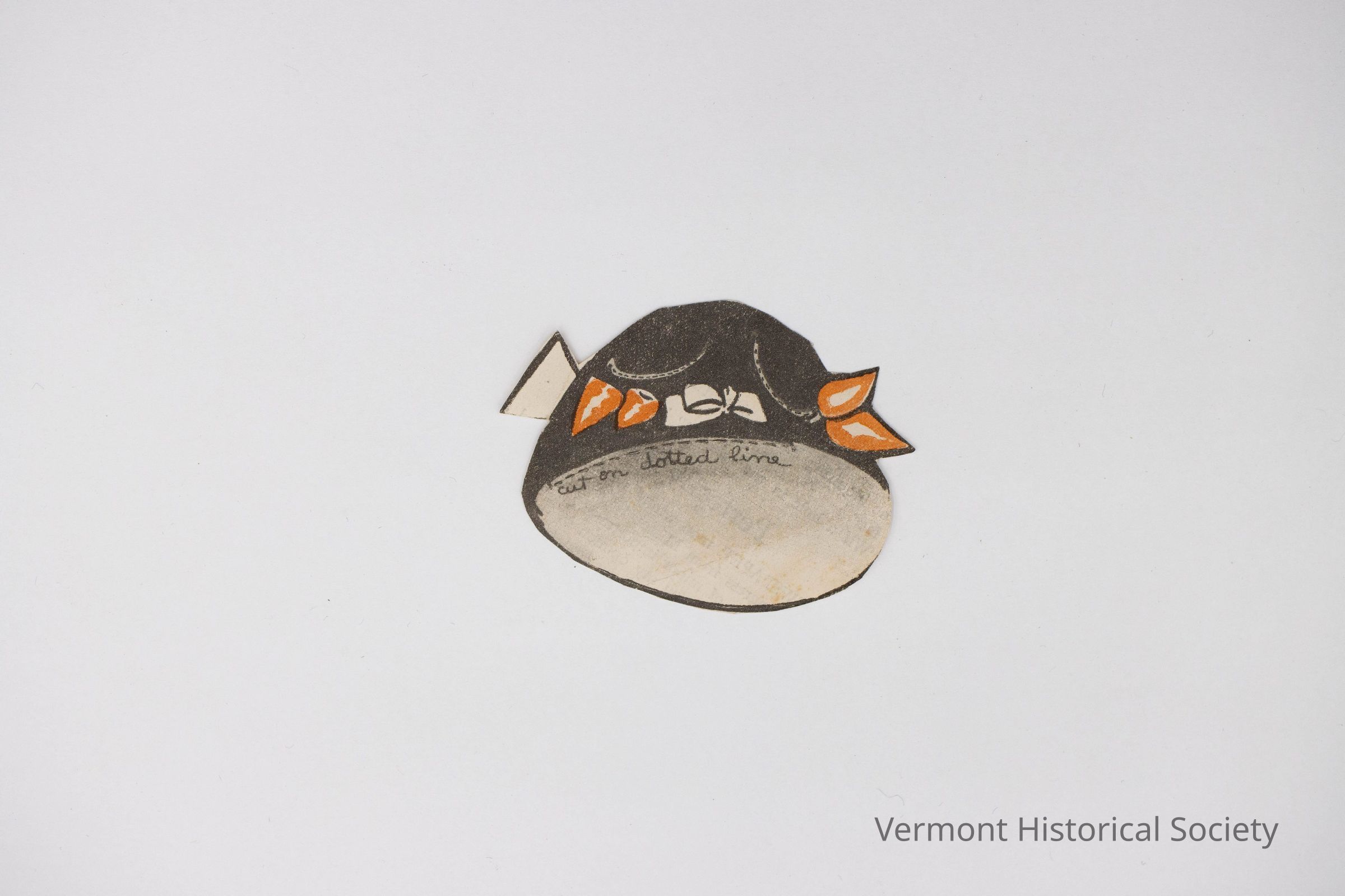 Printed paper hat for a paper doll. The brimless black hat is decorated with orange leaves and a white bow. The back shows a portion of a sales catalog page.Context