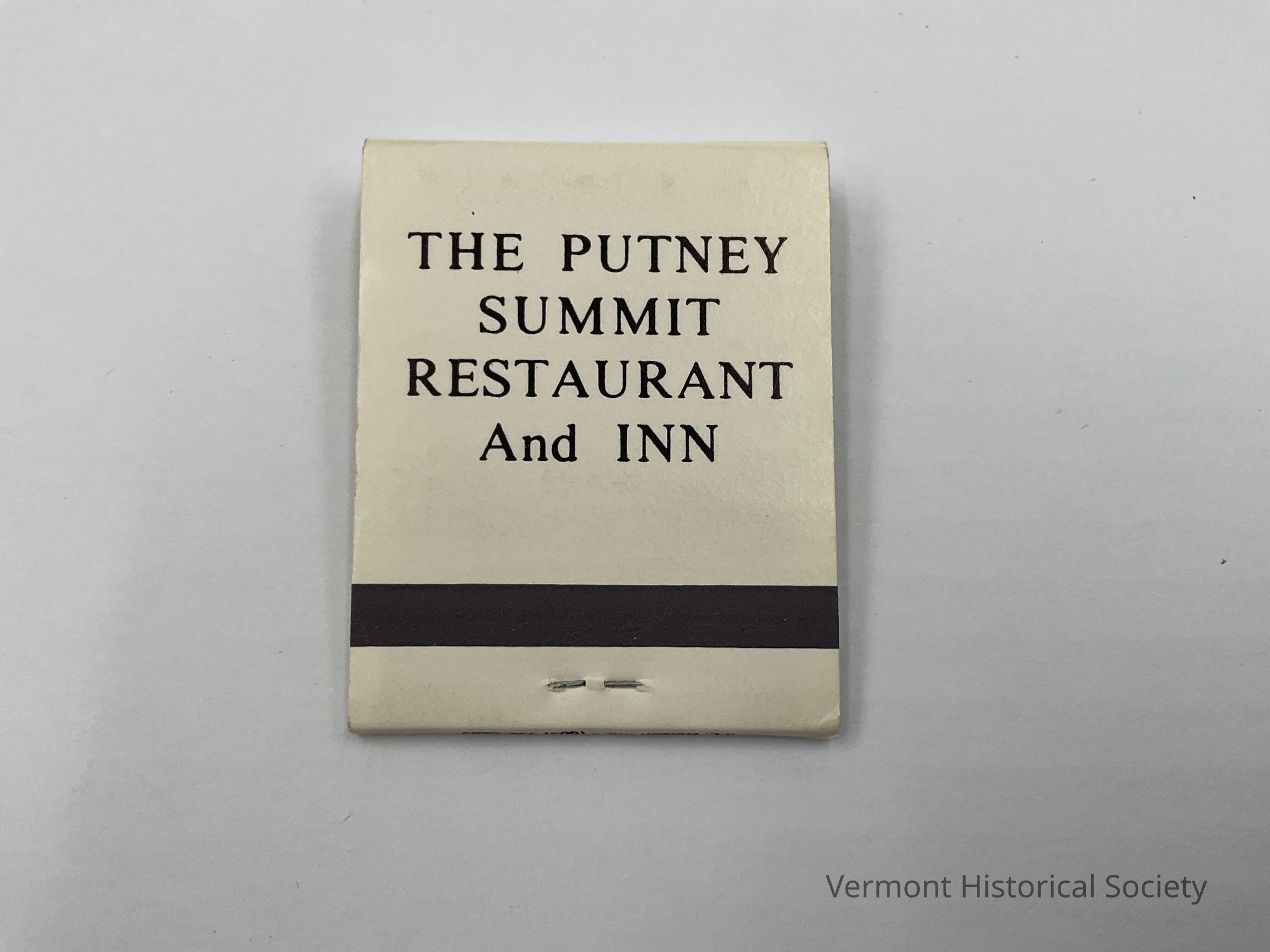 White matchbook with black image of a tree, horse and wagon and a barn in the distance. On the back is the name of the restaurant in black letters -- "The Putney Summit Restaurant and Inn." On the flap securing the white-tipped matches is the address -- Route 5, Putney, VT. -- and a warning that reads, Clove cover. Strike match on back." On the top edge is a telephone number: 802-387-5806. On the lower edge is the manufacturer or distributor: J.L. Nelson Inc., (603) 336-5692.Context