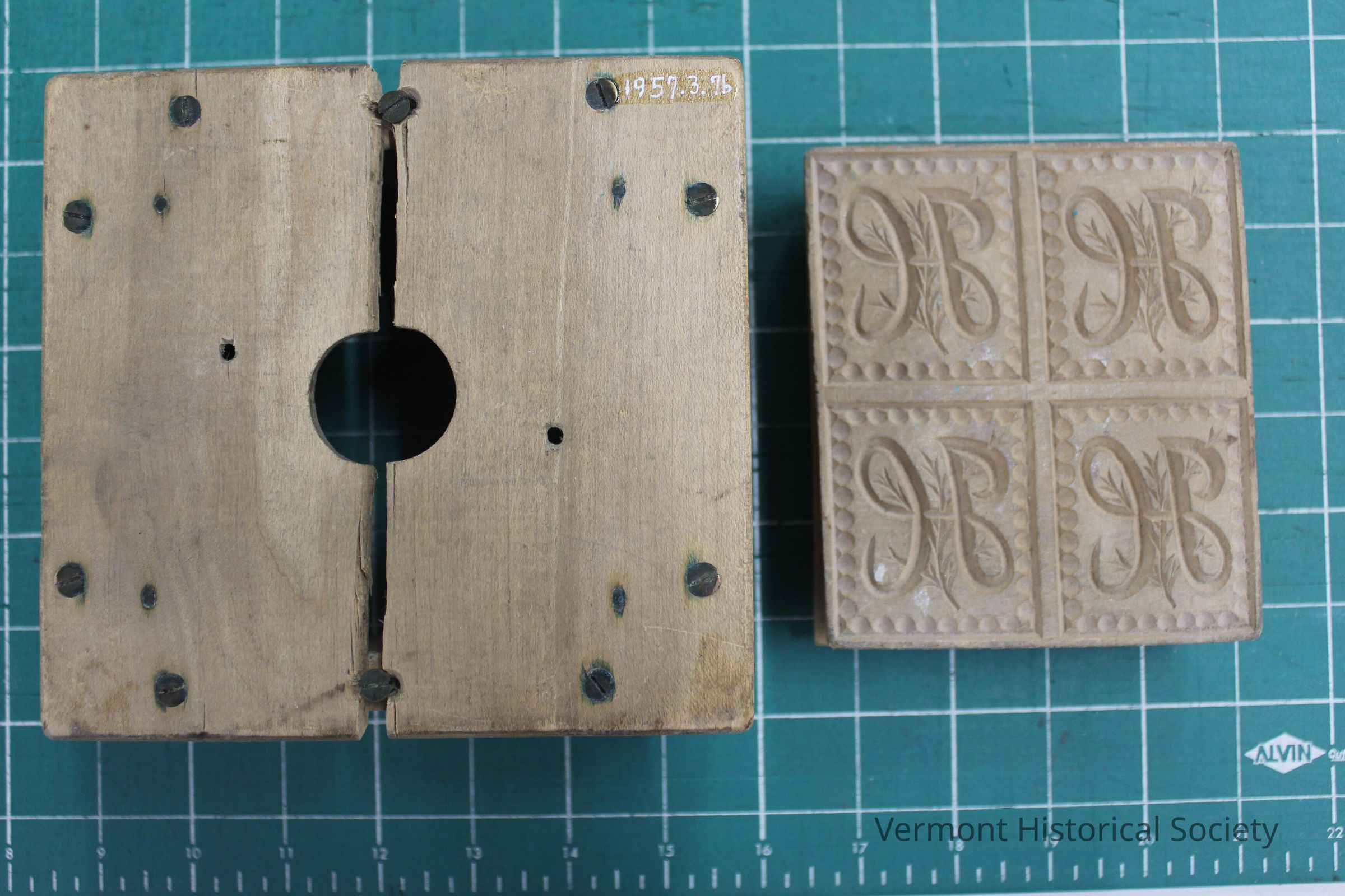 Butter molde consisting of a box and a press. The box has a hole drilled in the center of the top. The press is carved with a design of four tiles, each with a matching "H" over a sprig of rosemary.