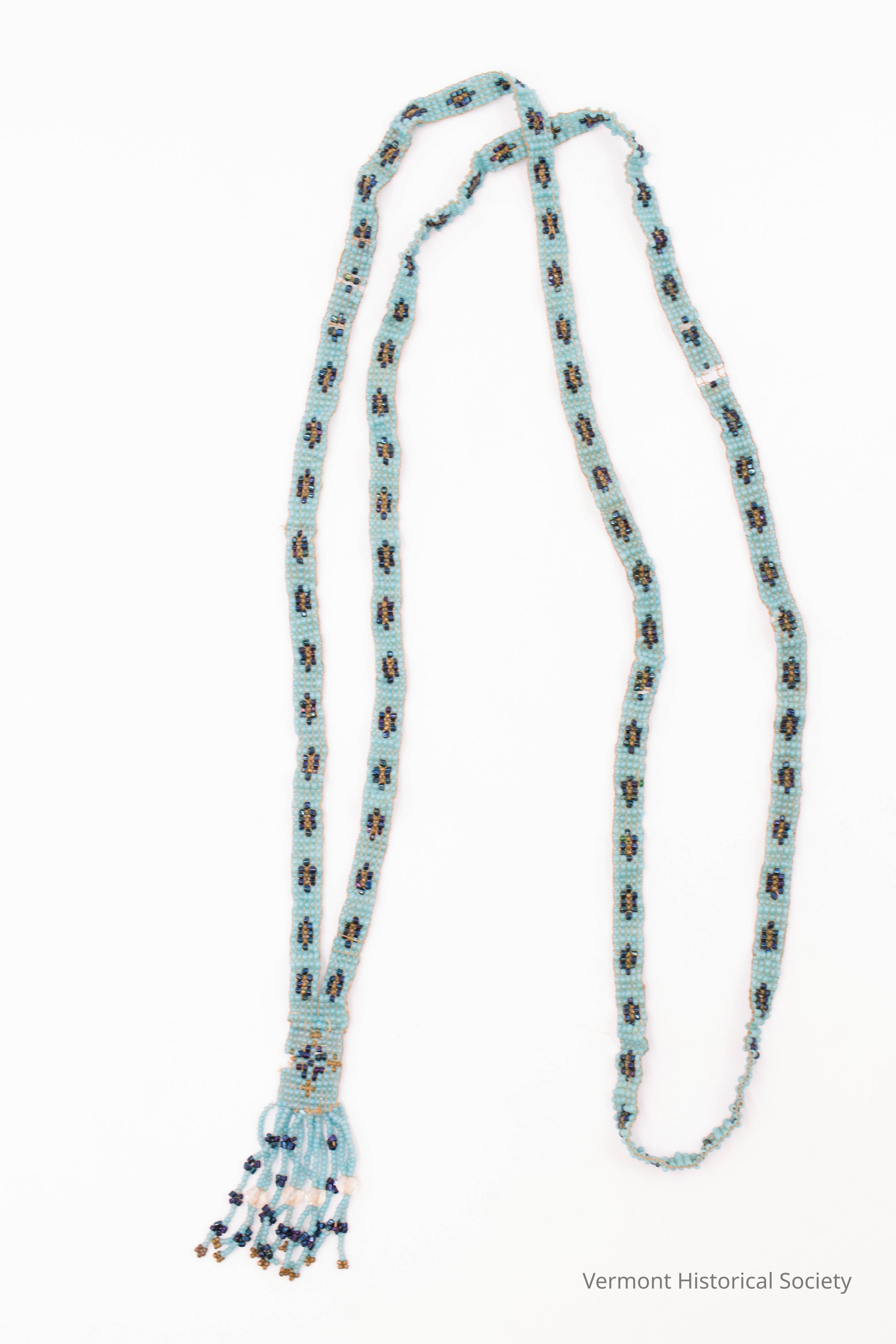 Long, loom-beaded necklace. The necklace is made of one length of 5-bead-wide weaving, with a floral pattern made from dark blue and gold glass beads, and a ground made of a light blue glass beads. The two ends of the length join together to form a sort of medallion with a bigger flower or snowflake pattern. The necklace culminates in a beaded fringe.